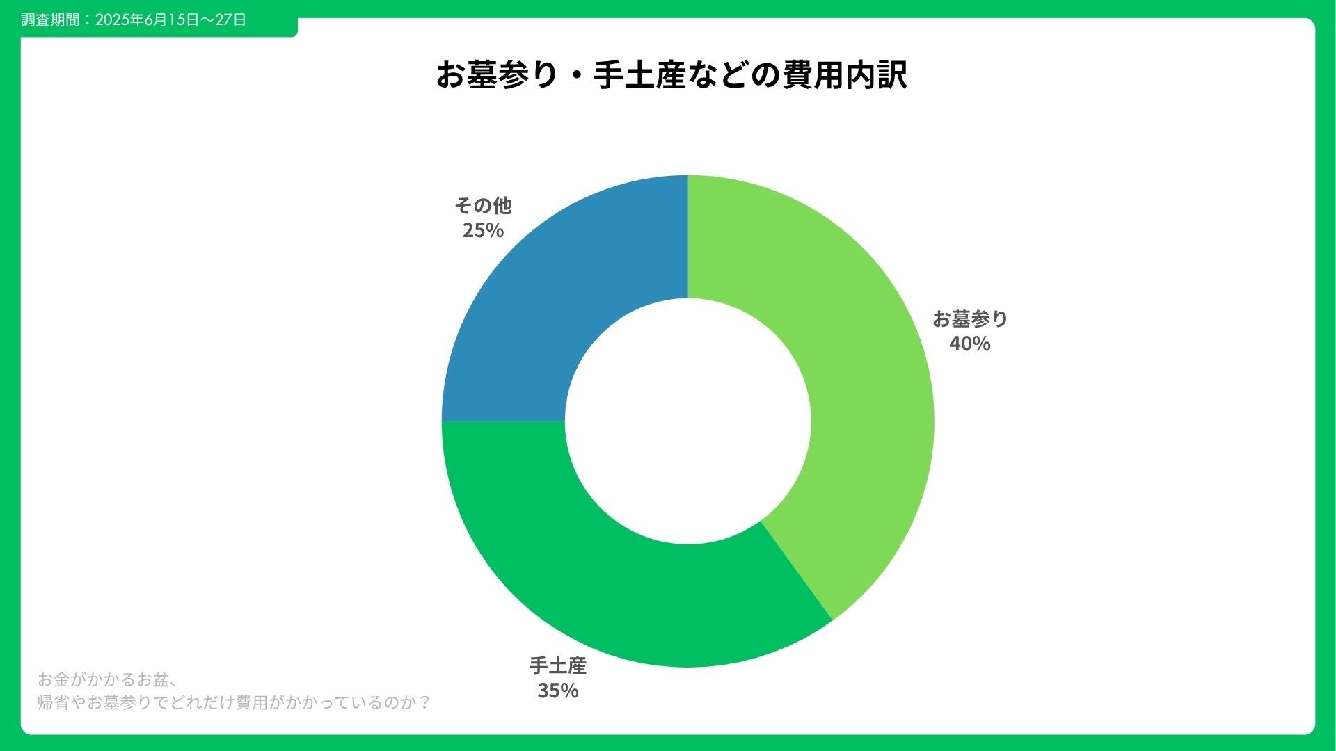 帰省費用に加え、お墓参りや親戚への手土産も大きな負担となります。支出内訳をみると、お墓参りが40%、手土産が35%、その他費用が25%と、交通費や宿泊費以外の支出割合が約4割を占めています。