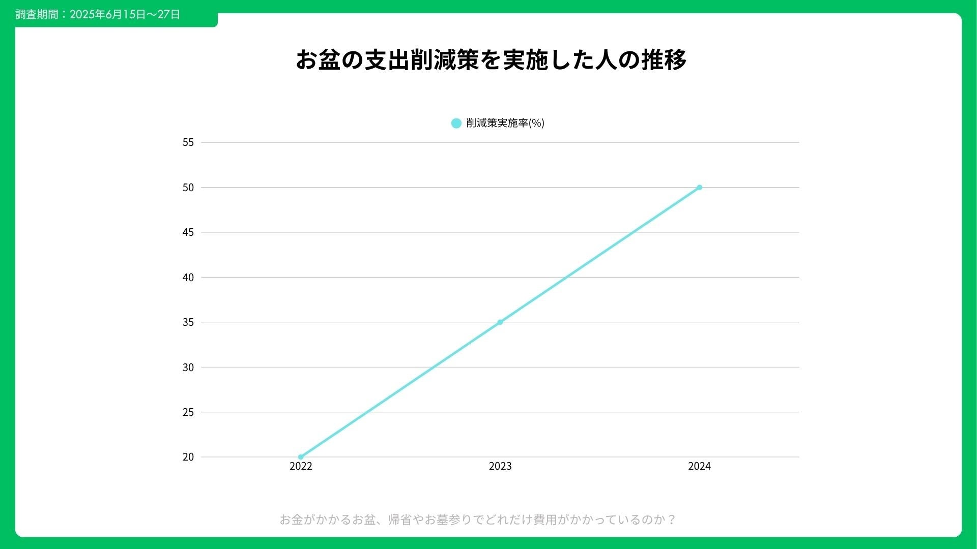 お盆の出費を抑えるために何らかの節約策を実施した人は、2023年で20%、2024年で35%、そして2025年には50%へと急増しました。