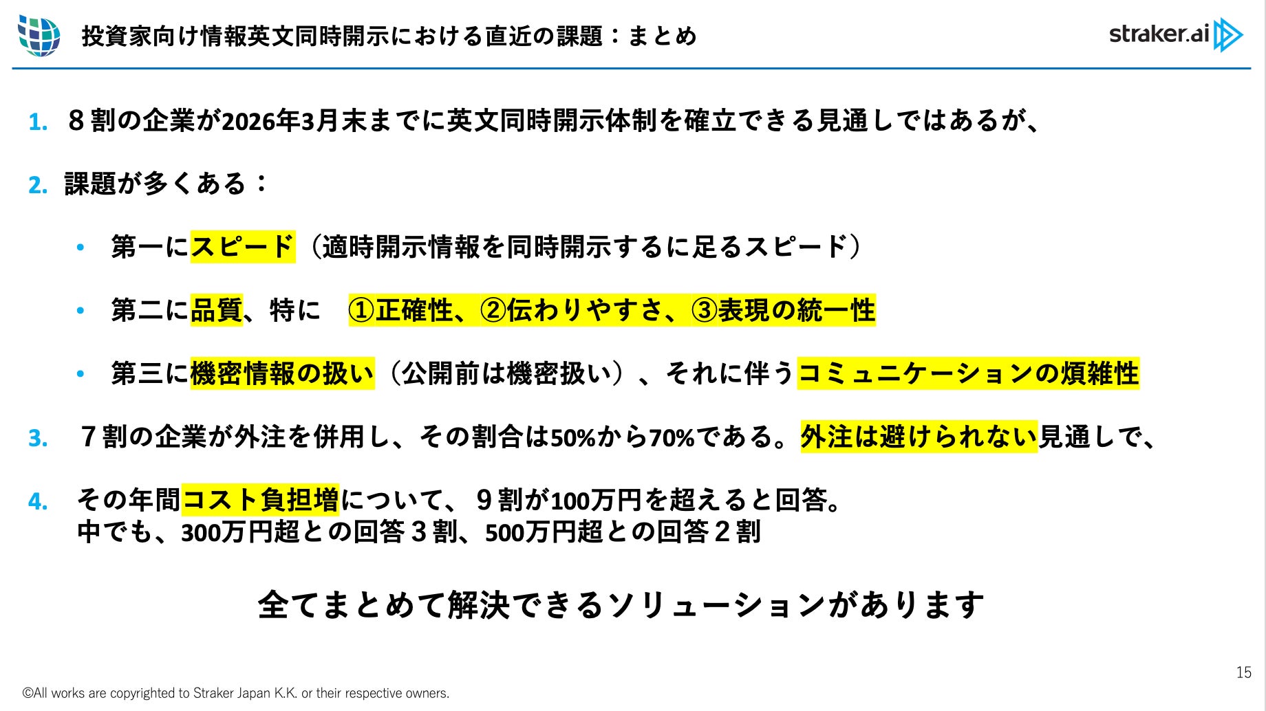 また、2025年11月にStraker JapanがIR担当者に行った独自の定量調査では、8割の企業が2026年3月末までに英文同時開示体制を確立できる見通しではあるものの、各企業で多くの課題があることが分かりました。課題として、最も多かったのが「スピード(適時開示情報を同時開示するに足るスピード)」です。次に「品質」、特に①正確性、②伝わりやすさ、③表現の統一性に課題が多く残ることが分かりました。