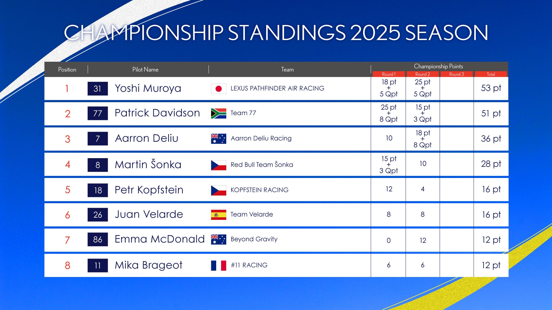 決勝は、王者・室屋と新星・アーロンによる初の対戦。両者ともノーミスのクリーンな飛行を見せる中、室屋が冷静かつ安定した速さで圧倒し、今季初勝利を挙げ、前人未踏の「シリーズ連覇」に王手をかけました。