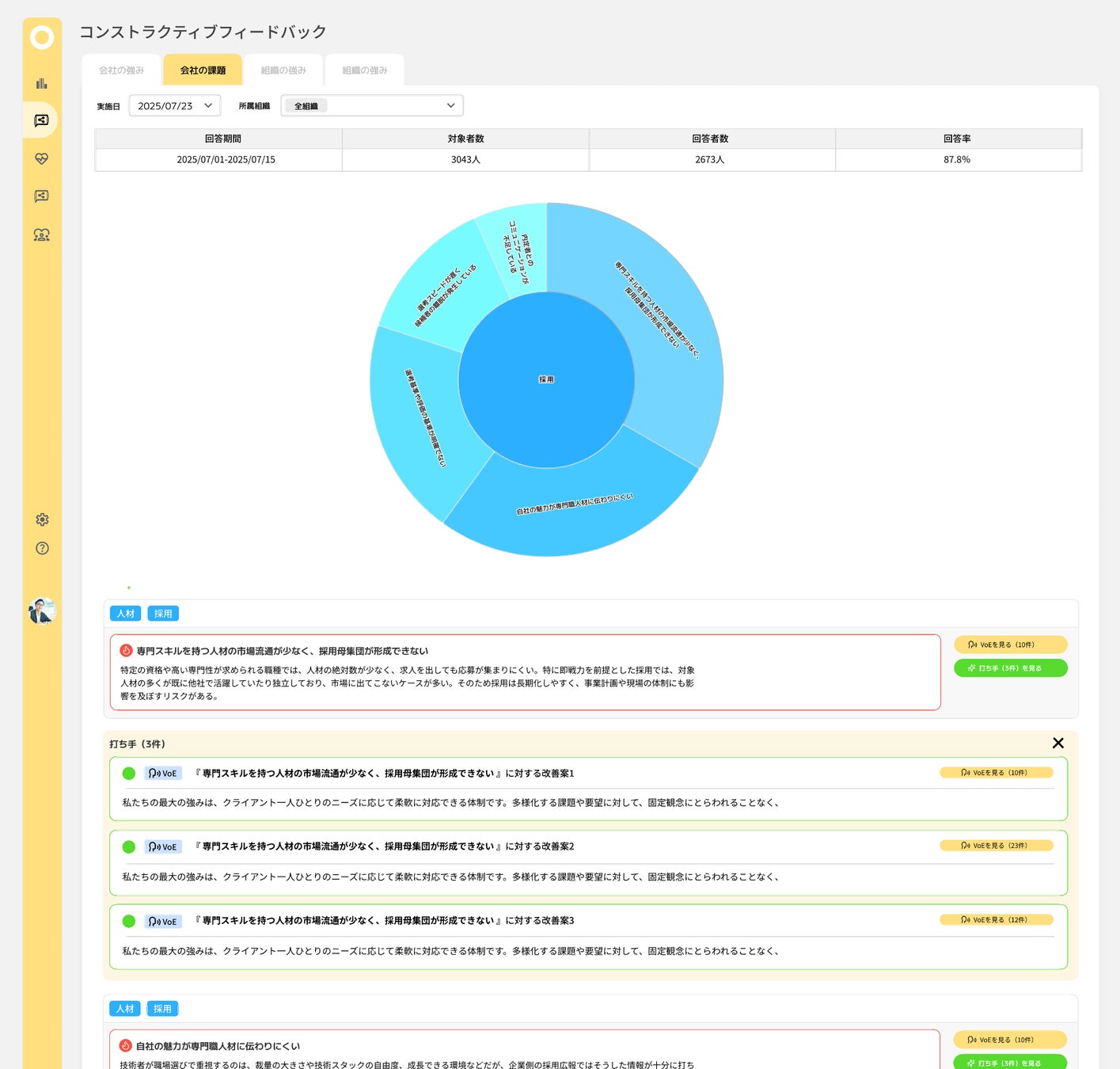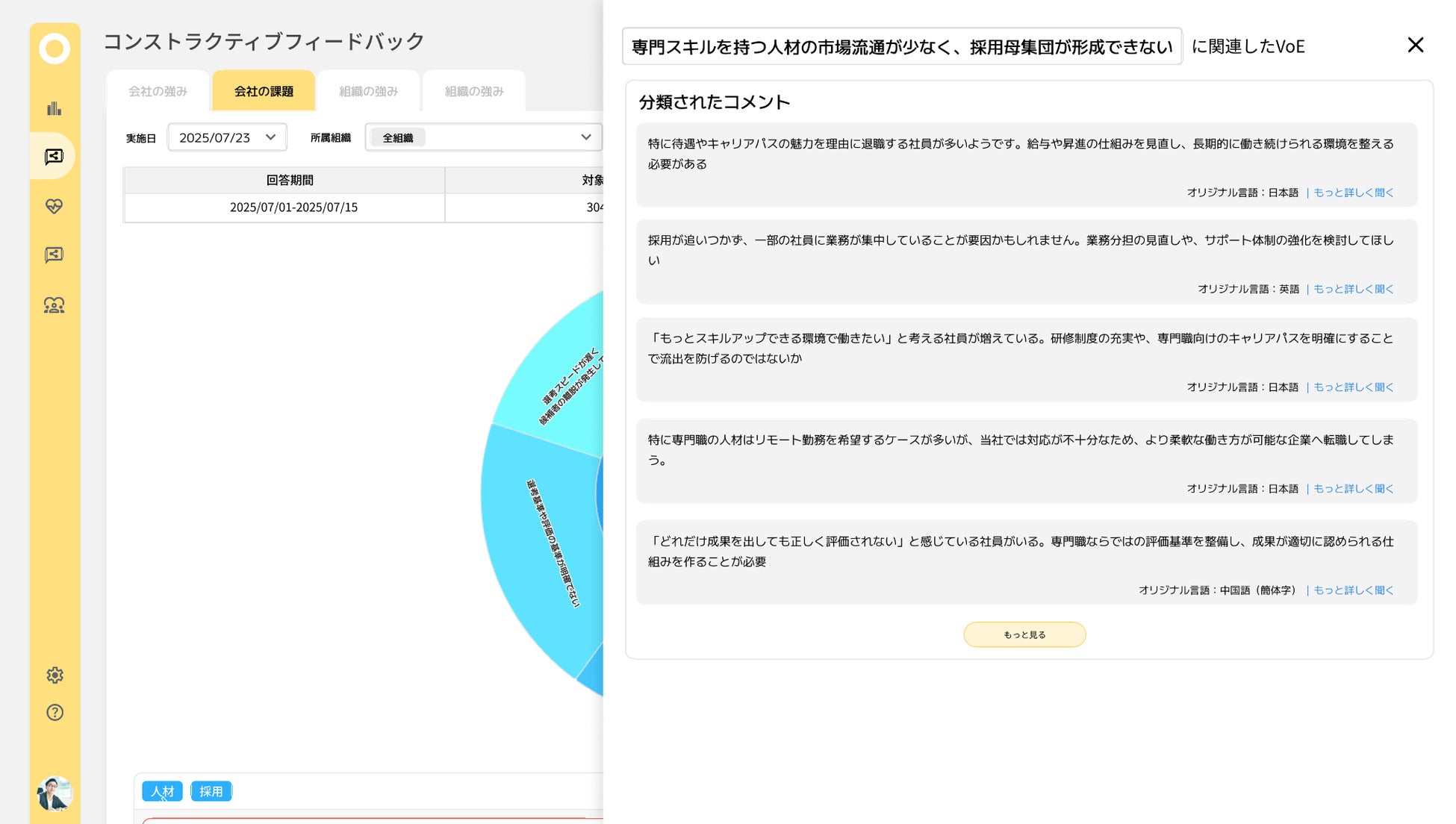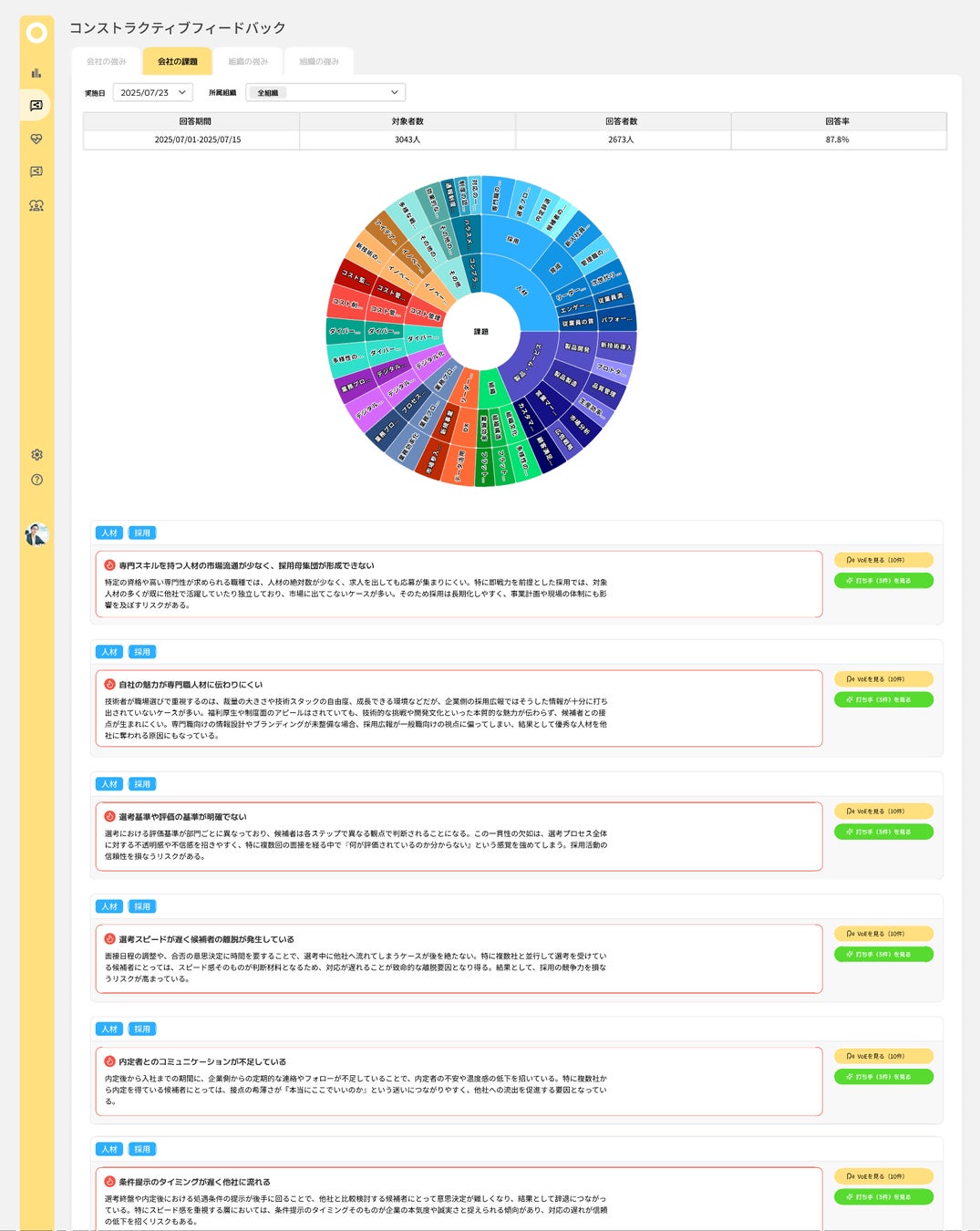 コンストラクティブフィードバックでは、収集したVoEをもとに分類を行い、それぞれの分類に属する課題をAIが要約します。さらに、課題を分類ごとに絞り込むことができ、サンバーストグラフ内の該当分類をクリックすると、その分類に含まれる課題のみが表示されます。