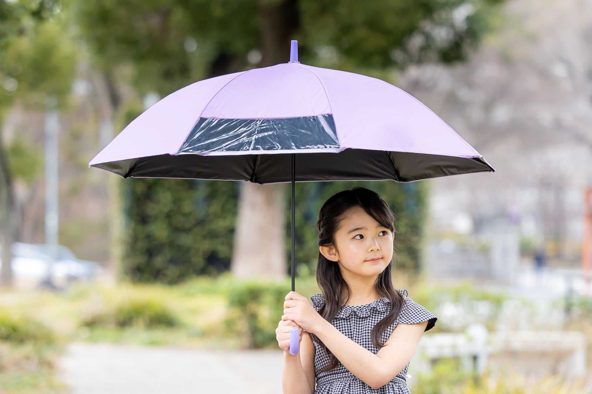 日傘というと、まだまだ「美容のために日焼けを防ぐもの」「女性が使うもの」というイメージが一般的には強いようですが、遮光・遮熱効果のある日傘(晴雨兼用傘)は熱中症予防対策グッズとしても注目されています。子どもは大人ほど背が高くなく、地面からの距離が近いために跳ね返った熱を受け、さらに体が未熟なため体温調整がうまく行かない場合もあり、大人が想像する以上に暑さを感じています。登下校時は日を遮るもののない炎天下を長時間歩く場合もあり、熱中症予防対策のひとつとしても、子どもにこそ日傘―「持ち歩ける日陰」を使用することをお勧めします。