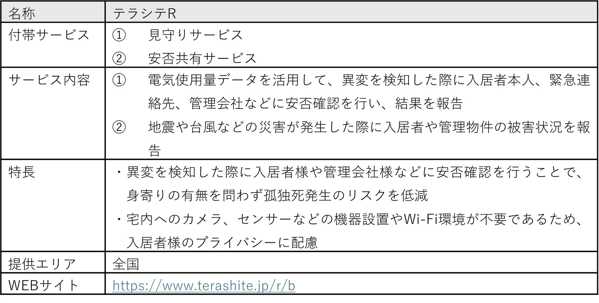 株式会社ジャックス(本部:東京都渋谷区、代表取締役社長:村上 亮)は、中部電力ミライズコネクト株式会社(愛知県名古屋市、代表取締役社長:秋山 光輝)との協業により、電気使用量データを活用して入居者を見守るサービス「テラシテR」(以下「本サービス」)を付帯した新たな家賃保証商品を開発し、賃貸物件の管理会社様向けに提供を開始いたしました。