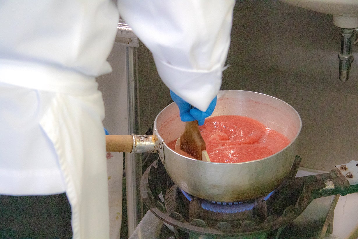 このソースは、越後姫(苺)、枝豆、ルレクチェ(洋梨)、白桃、南瓜の5種類の新潟産フルーツや野菜を使い、シンプルながらもその美味しさを引き出す絶妙なバランスで仕上げています。 各食材の元々の味を楽しんでいただけるよう、熟練パティシエならではの絶妙な加減でシンプルに味付けをしました。