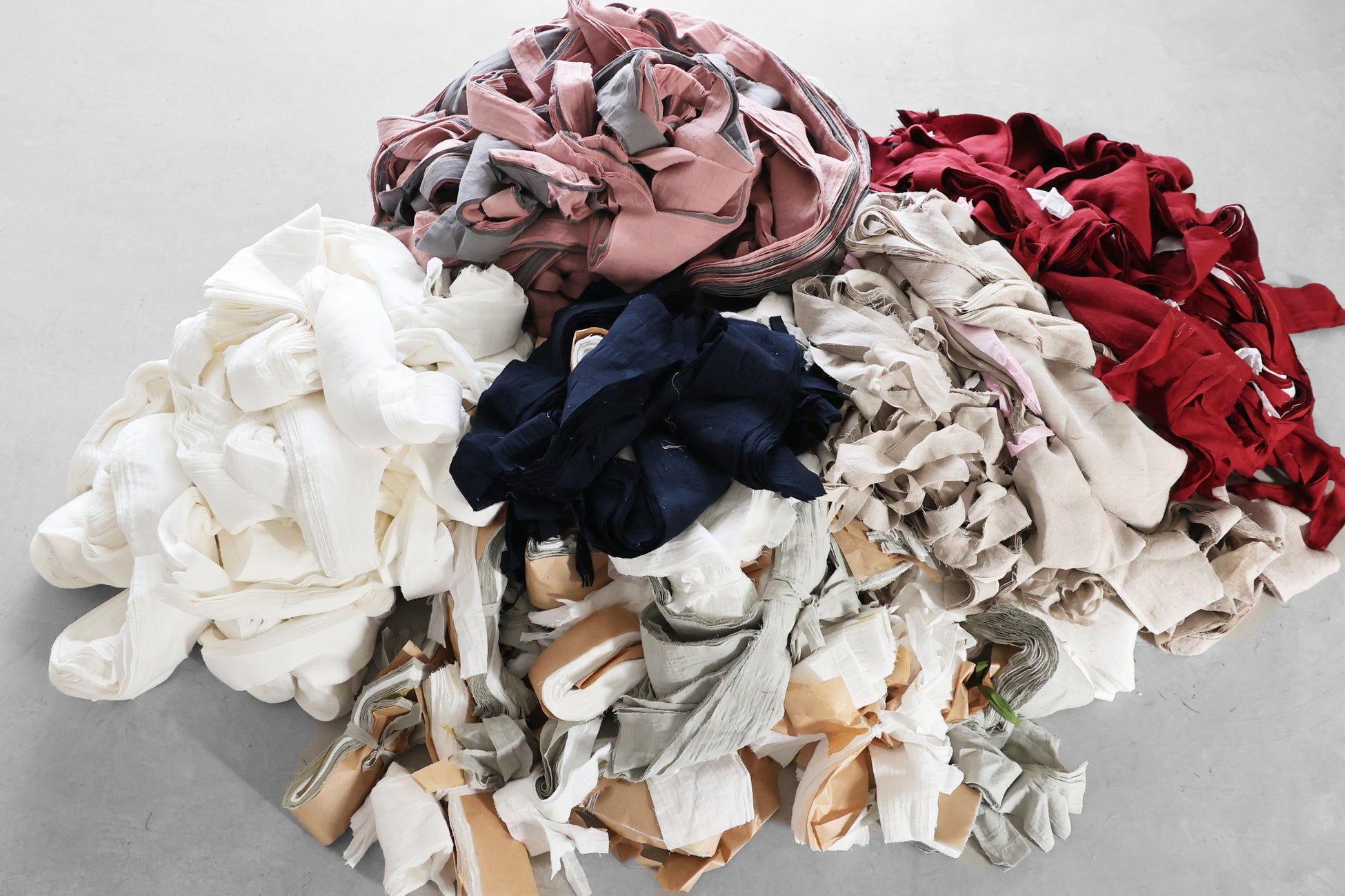 現在、「HUIS(ハウス)」では、年間 40,000 着以上の製品を⽣産しています。洋服の⽣産過程では、裁断クズや仕上がり確認のためのハギレ⽣地などが発⽣し、それらは通常廃棄物となってしまいます。