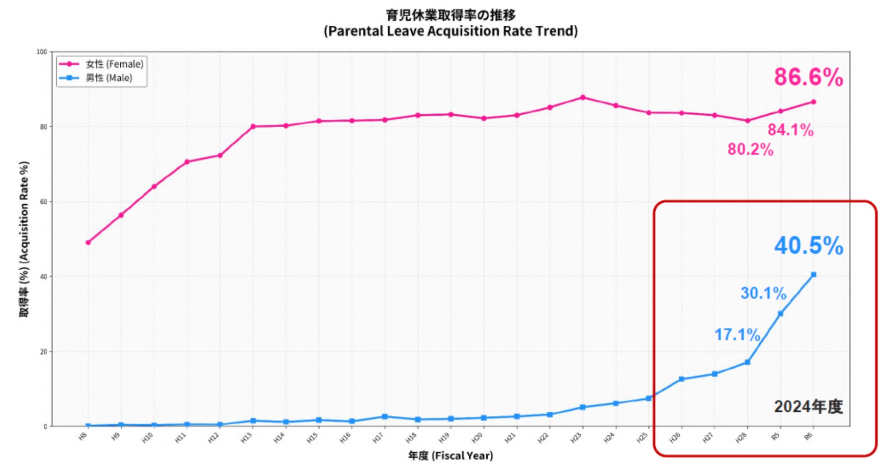 令和5年度、民間企業における男性の育休取得率は40.5%に達し、前年度から10.4ポイントの大幅増となりました。育休は「特別なもの」から「当たり前の権利」へと急速に変化しています。(※)