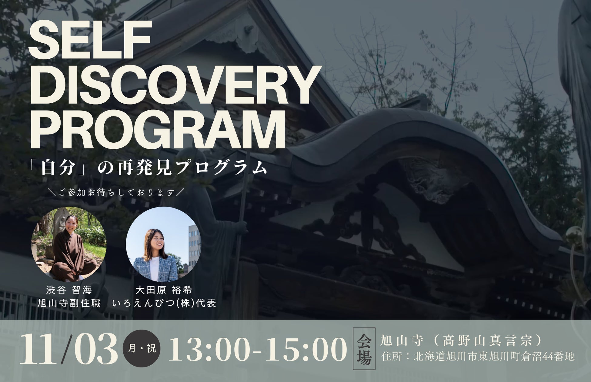 高野山真言宗 旭山寺(所在地:北海道旭川市、副住職:渋谷智海)と、キャリアセミナー・広報コンテンツ制作を行ういろえんぴつ株式会社(所在地:北海道旭川市、代表取締役:大田原裕希)は、現代人が抱える生き方・働き方の迷いに対し、仏教の重要な教えである【手放す】を体験する共同ワークショップ「SELF DISCOVERY PROGRAM:「自分」の再発見プログラム」を、2025年11月3日(月・祝)に旭山寺にて開催します。