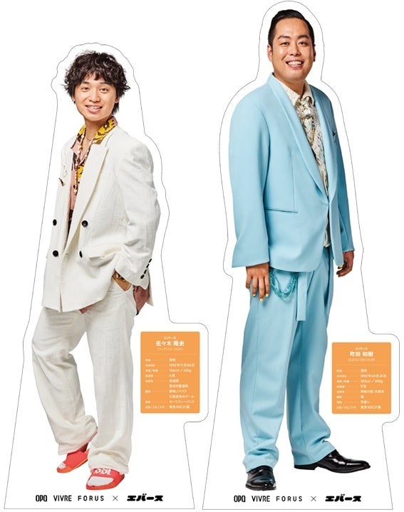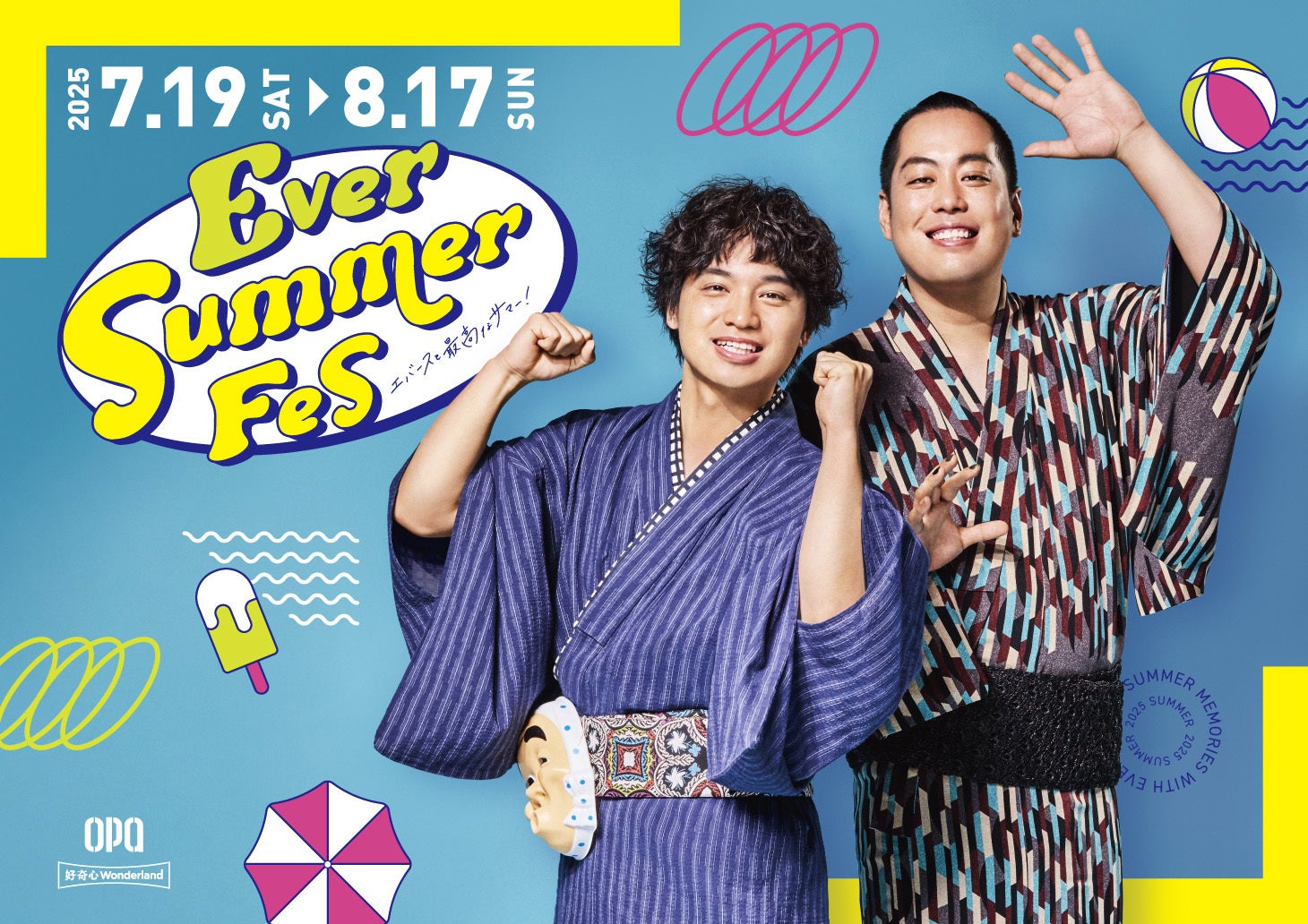 撮り下ろしの動画やビジュアルに加え、館内放送ではエバースのおふたりが「この夏、買いたいもの」をテーマに、軽快なトークを繰り広げるスペシャルコンテンツを展開。また、お馴染みの漫才衣装をはじめ、舞台上とはひと味違うスタイリッシュなスーツや夏らしい浴衣姿の等身大パネルも館内に登場します。