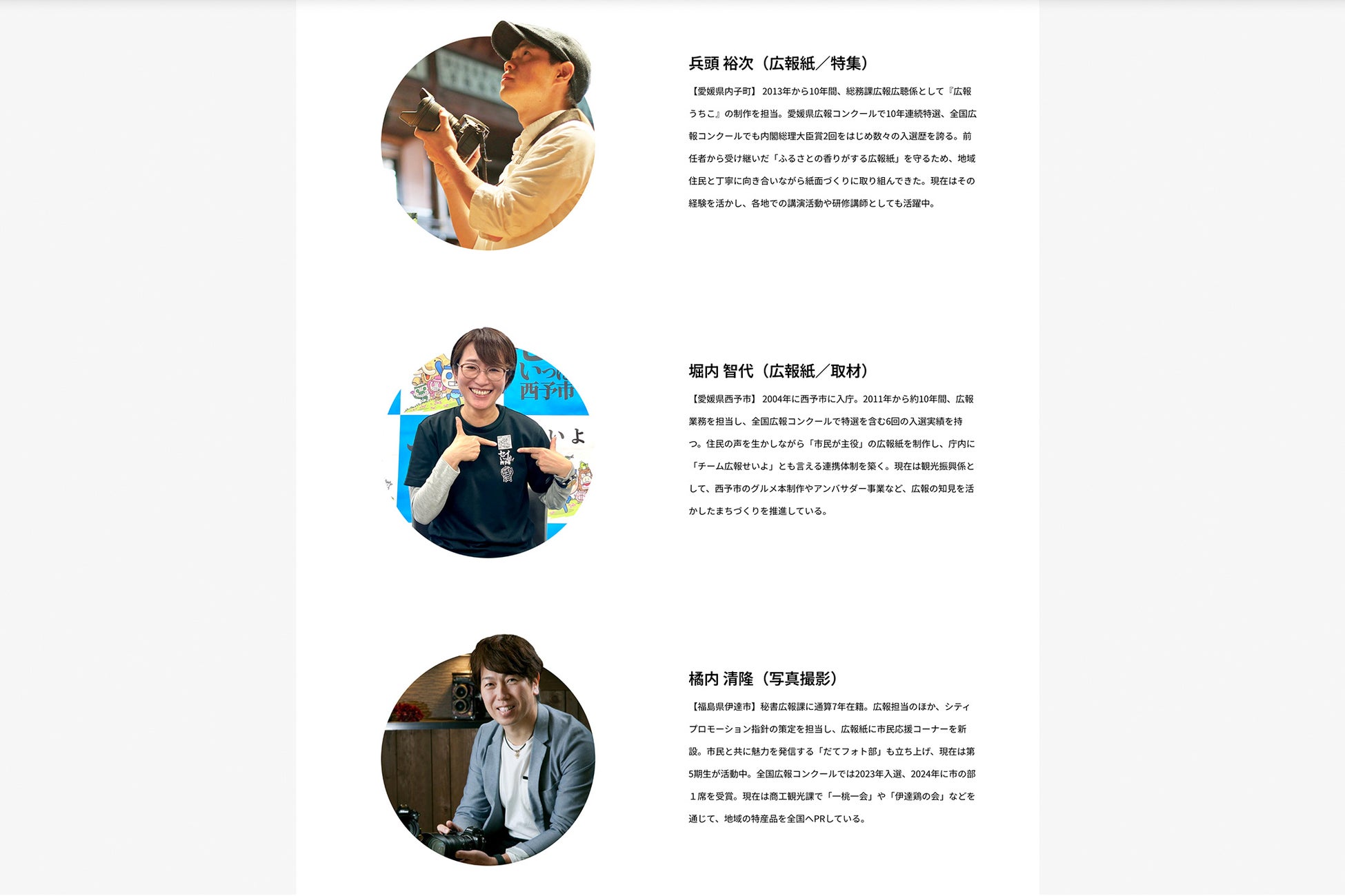 経験と知識が豊富な現役職員の運営メンバーおよび広報業界で実績を残してきた元公務員などが、卓越したスキルを公開します。広報紙・写真・動画・SNS・シティプロモーションなど、広報活動のあらゆる分野をカバーします。