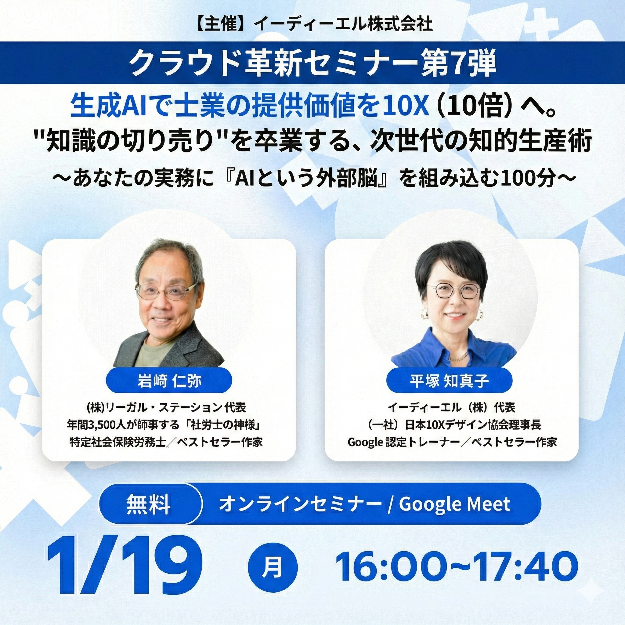 「スモールDXで10倍成果実現」を推進するイーディーエル株式会社(本社:茨城県つくば市、代表取締役:平塚知真子)は、士業・コンサルタントの第一線で活躍し、「社労士の神様」の異名を持つ岩崎 仁弥 氏をお迎えし、生成AIで士業の実務を変革する無料オンラインセミナー(クラウド革新セミナー第7弾)を、2026年1月19日(月)に開催いたします。