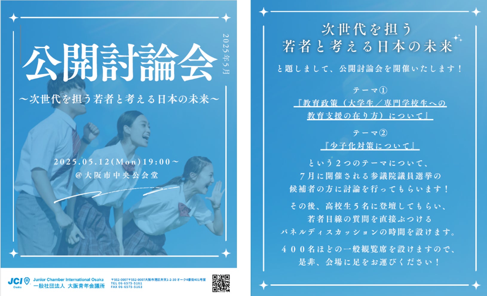 本年7月に実施される参議院議員選挙を控え、政治参画の意識向上を目的として、大阪市民の皆様に大阪、ひいては日本の未来や現在の社会課題、そして選挙について考える場として、各政党党員の方々をお招きして、「公開討論会 ~次世代を担う若者と考える日本の未来~」を開催する運びとなりました。党員の方々による討論会に加え、副題にもあるように、次世代を担う若者として高校生にも登壇してもらい、高校生から党員の方々へ直接質問を投げかけていただく時間も設ける予定となっております。