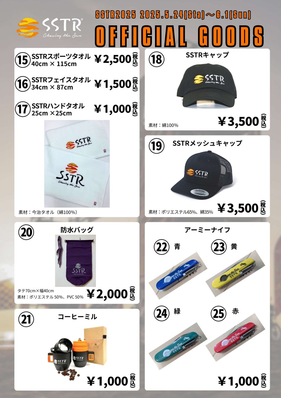 SSTR2025のオフィシャルグッズを5月24日(土)からゴール会場(石川県羽咋市千里浜なぎさドライブウェイ終点特設会場)にて販売。グッズの一部はSSTR2025終了後に、特設サイトでも販売予定。