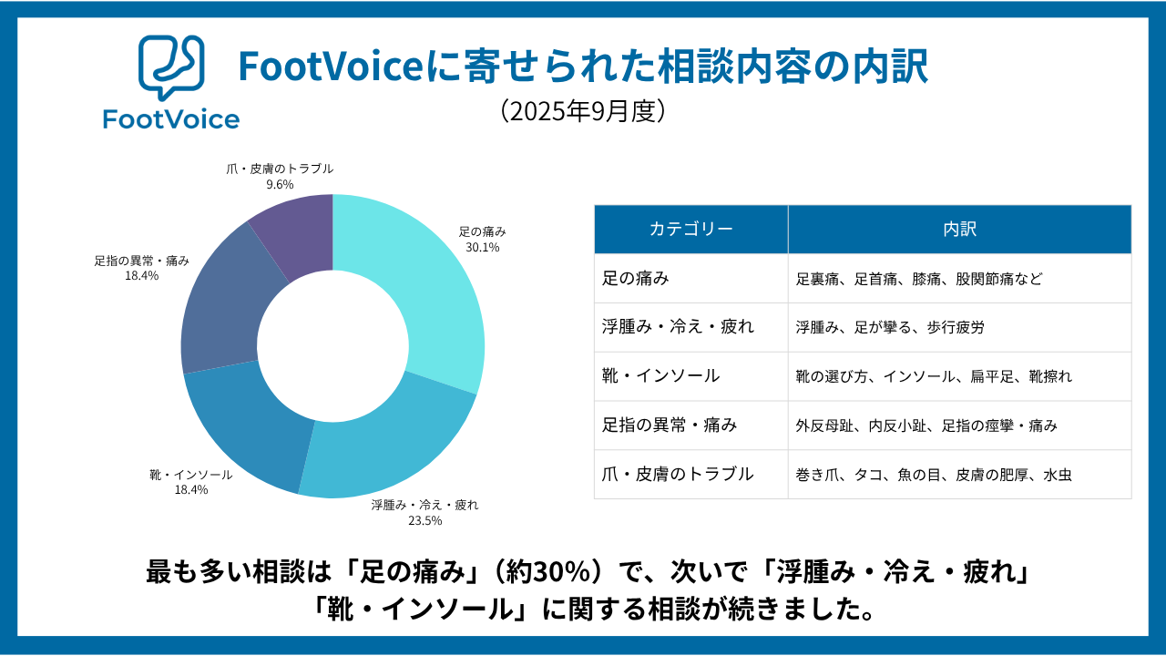 株式会社NarrativeFoot(本社:東京都中央区、代表取締役:我妻誠一)は、足と靴のWEB相談サービス「FootVoice」が2025年9月より複数の企業・健康保険組合にて導入されたことを発表いたします。サービス提供開始直後から高い利用があり、9月1か月間で150件を超える相談が寄せられるなど、足の健康に関する働く世代の高い関心とニーズの強さが明らかになりました。本サービス導入により、導入先企業の従業員や健保組合の組合員は日常の足トラブルや靴選びに関する専門家相談が可能となり、転倒災害防止やロコモティブシンドローム対策、女性の健康支援策につながる健康サポートが強化されます。