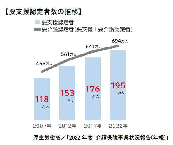 国内では高齢化に伴い、公的介護保険制度の要介護認定者とともに、要介護状態の前段階である要支援認定者数も増加傾向にあります。そうした要支援状態は、状態の維持・改善可能性が高い特長があり、適切なリハビリ等のサービスを受けることで要介護状態への重症化予防が可能となります。介護サービスのための公的介護保険制度の利用には1-3割(※1)の自己負担があり、それ以外にもシャワーチェア等の福祉用具購入費といった介護初期費用が必要となる場合もあることから、介護に必要な資金への備えとともに、お客さまのQOL向上に向けて、要支援状態から重症化に備えることは大変重要です。こうした背景を踏まえ、公的介護保険制度の要支援1以上から保障し、軽度な要支援状態に備えることでお客さまの重症化予防を応援する「要支援・介護保険」を発売します。