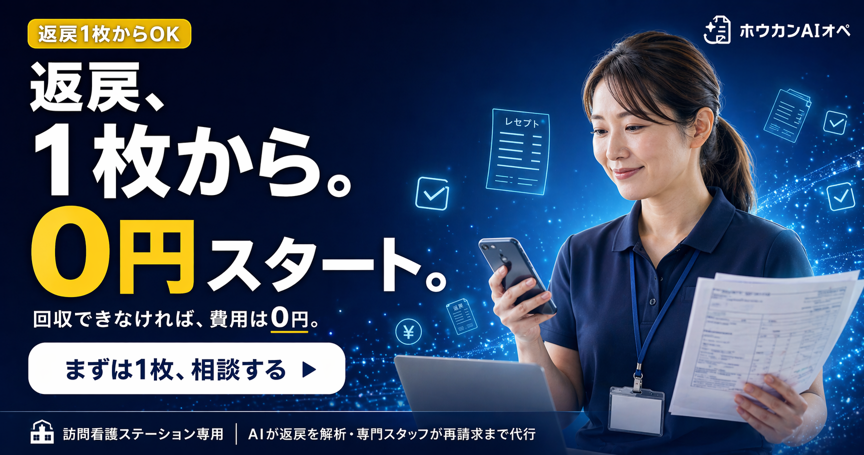 クラシテクは、2025年10月よりAI業務支援サービス「AIオペ」を展開し、すでに100を超えるステーションに利用されています。多くのステーションの現場を伴走サポートする中で見えてきたのは、どのステーションも日々の訪問・記録・請求業務に追われ、財務上は最も素早く対応されるべき返戻対応が専門知識の不足から後回しにされている現実でした。現場が汗をかいて訪問し、積み上げた売上が、返戻という形で眠ってしまう——本来受け取れるはずの報酬が、手続きの壁だけで失われていく。この状況を早急に改善すべく、返戻1枚から、0円から、というスタートにしました。 手元の1枚を送っていただくだけで開始でき、再申請対象外なら費用は0円。訪問看護ステーションは金銭的リスクも、心理的ハードルも負うことなく試せます。
