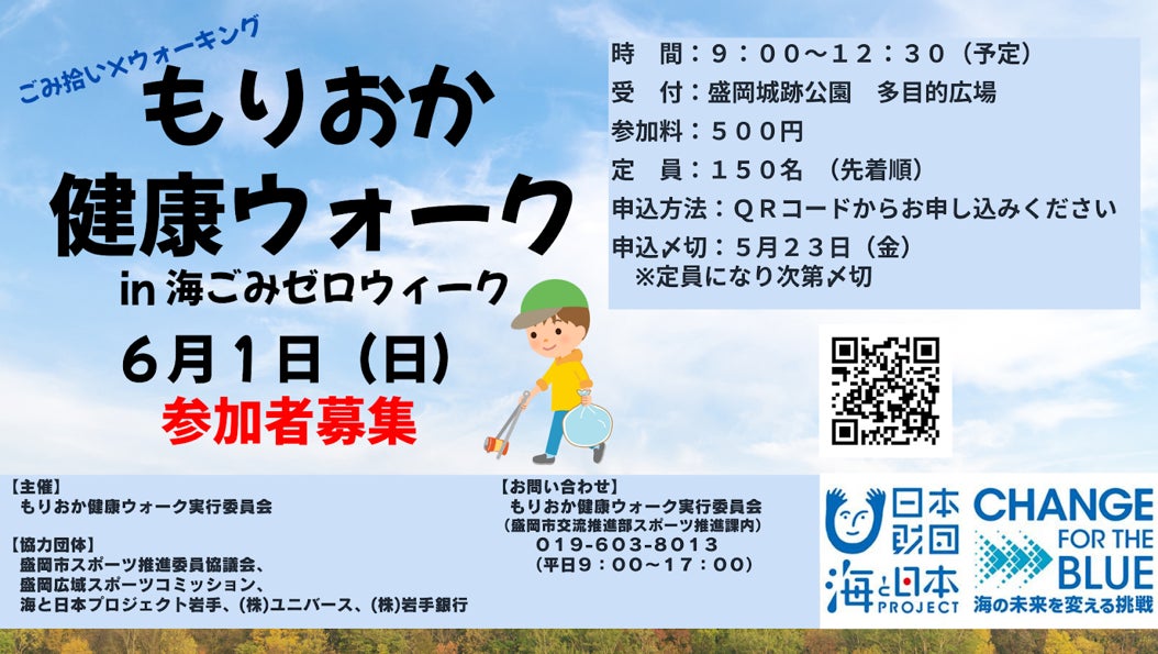 一般社団法人海と日本プロジェクトin岩手は、岩手のキレイで豊かな海を守り、未来へつなぐため、また岩手の皆様の健康増進のために、もりおか健康ウォーク実行委員会が2025年6月1日(日)に盛岡城跡公園にて開催する「もりおか健康ウォークin海ごみゼロウィーク」の参加者を募集いたします。