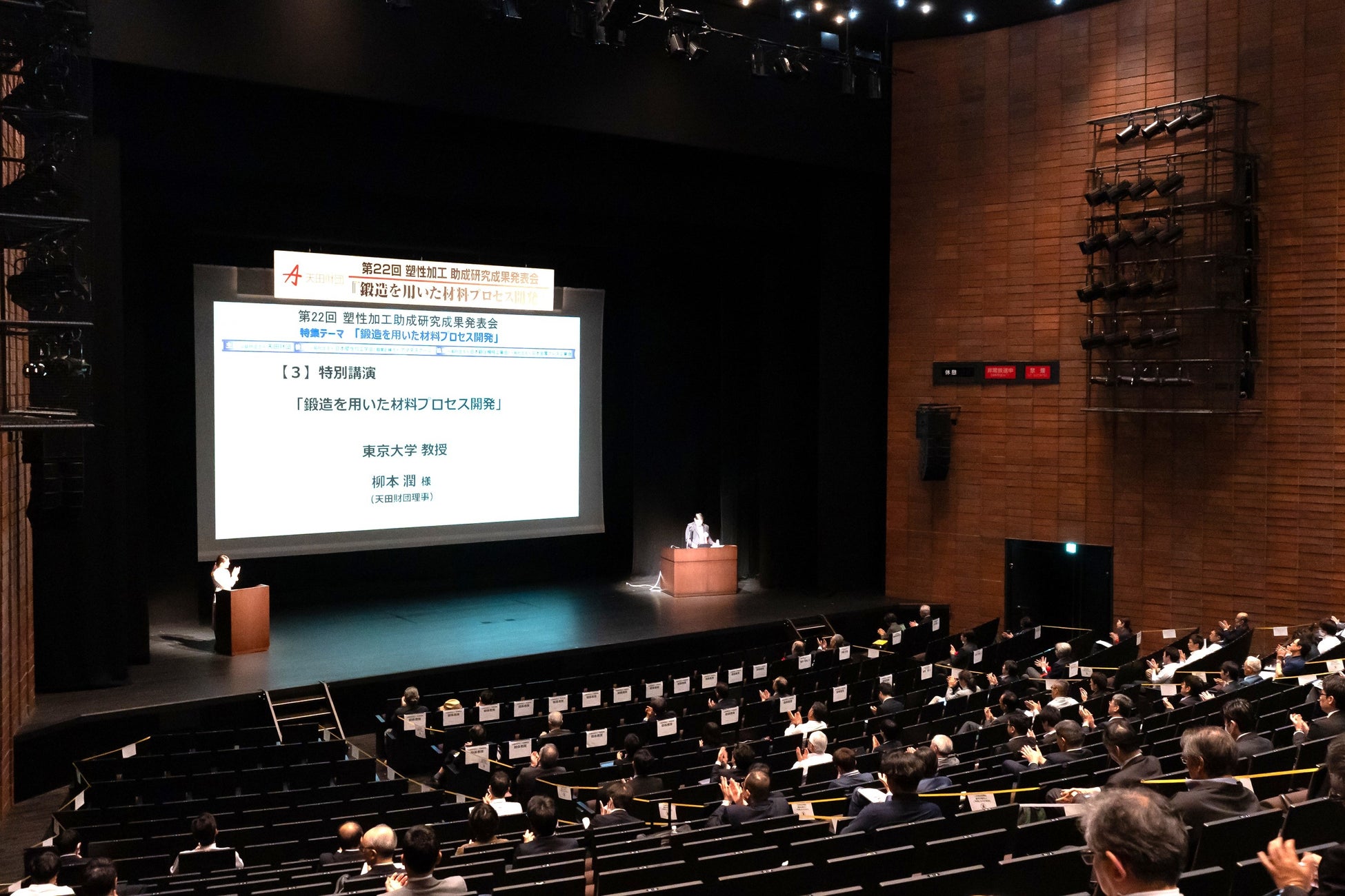 今回のテーマは「鍛造を⽤いた材料プロセス開発」で、過去に当財団が助成した研究の中から、テーマに沿った研究成果の発表のほか、特別講演、企業講演が行われました。