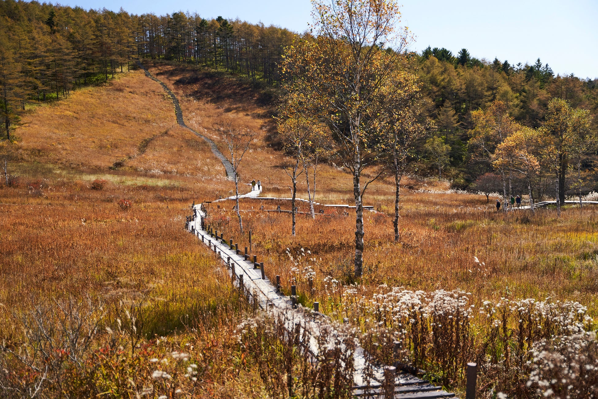 入笠湿原では黄金色に染まる草紅葉が11月初旬まで見頃となり、湿原一面が秋色に包まれる。その後は環境整備期間に入るため、観賞の機会は今が適期だ。