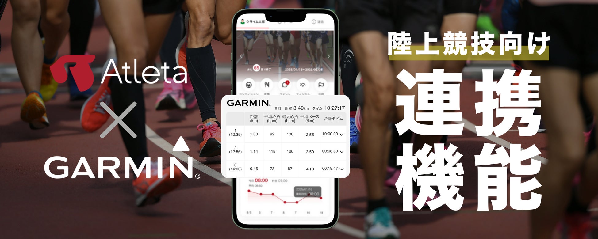 クライムファクトリー株式会社が提供する、選手データとチームコミュニケーションプラットフォーム「Atleta(アトレータ)」は、陸上界に広く浸透しているウェアラブルデバイス「Garmin」とのデータ連携機能をリリースします。