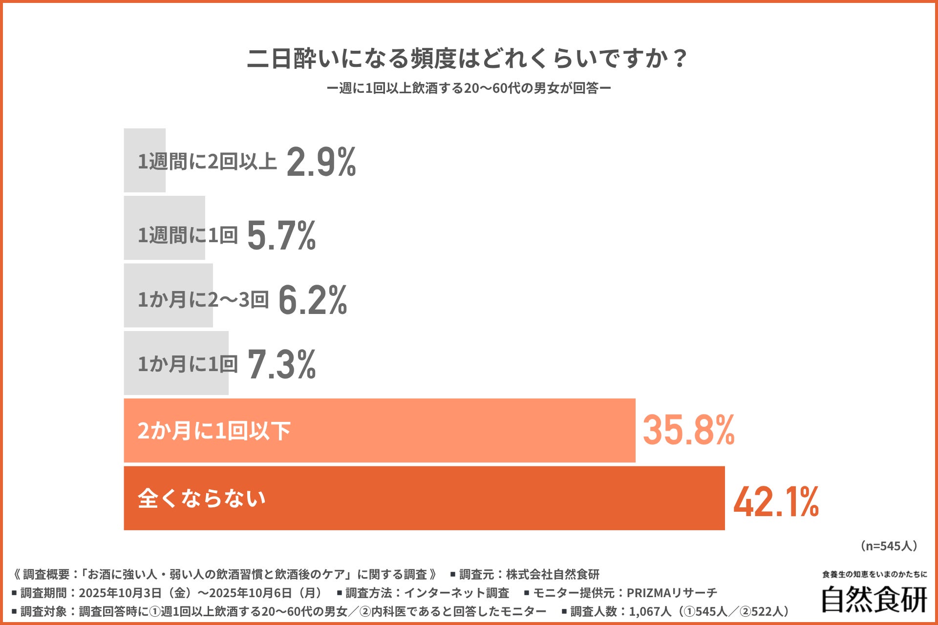 二日酔いに『全くならない』と回答した方が約4割となり、飲酒翌日の不調を感じにくい方が多数派となりました。