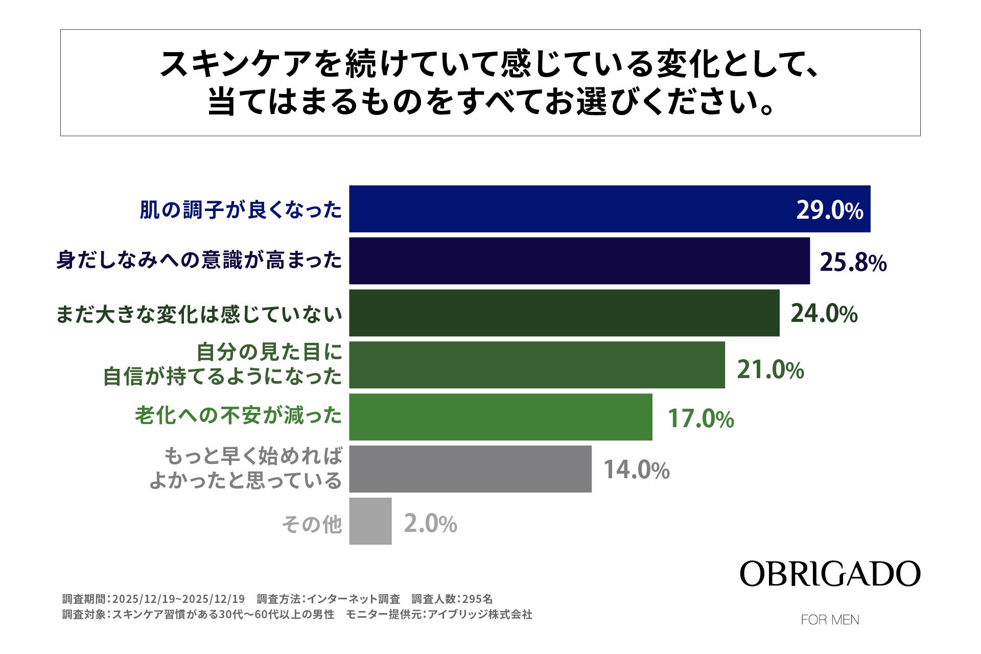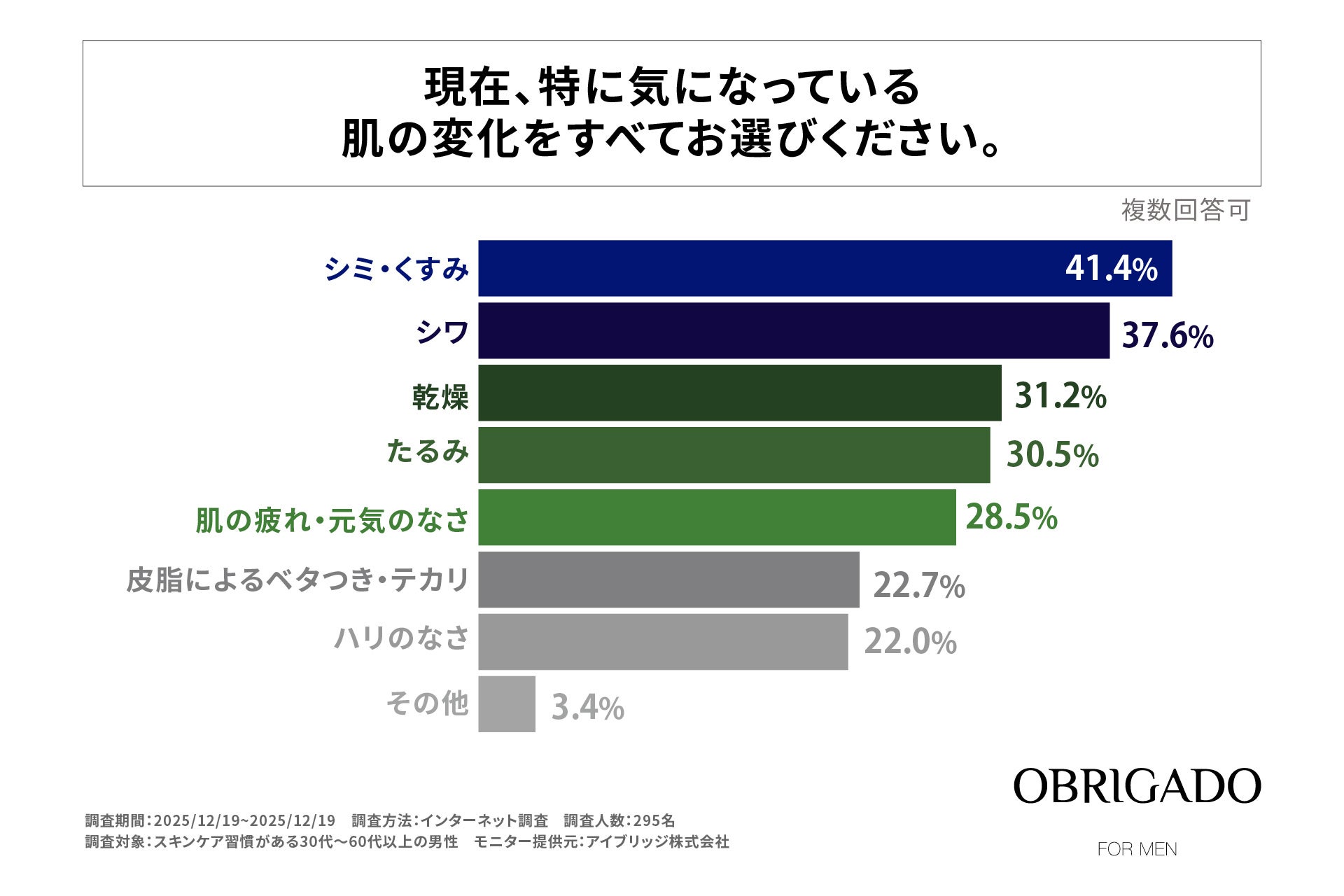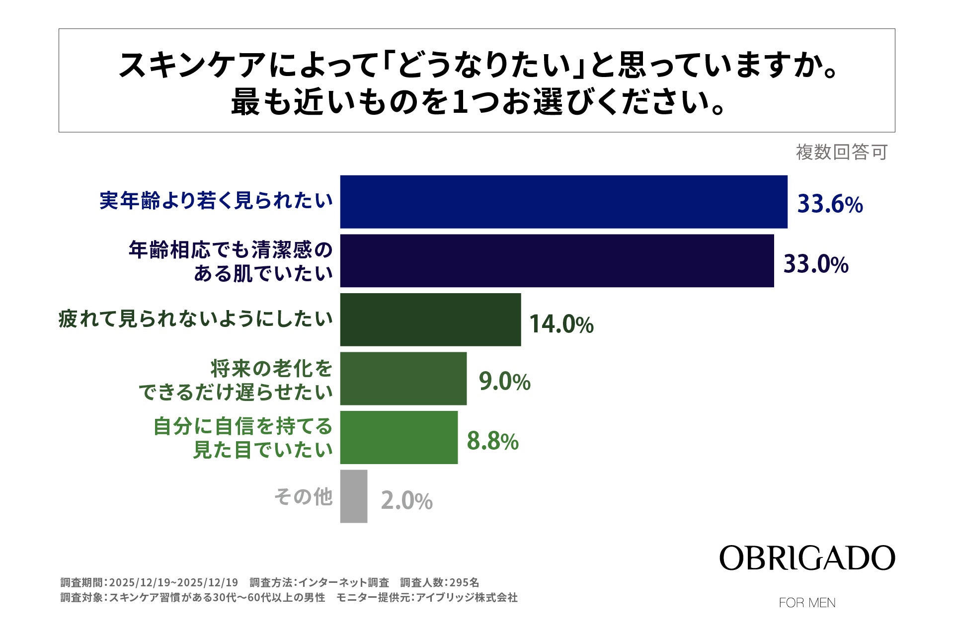 株式会社ビエスト化粧品(本社:大阪府大阪市、代表取締役:國澤 和人)が提供する「OBRIGADO」(オブリガード)は、スキンケアを実践している30代〜50代男性295名を対象に、肌の老化を意識したきっかけやスキンケアへの意識に関する調査を実施しました。