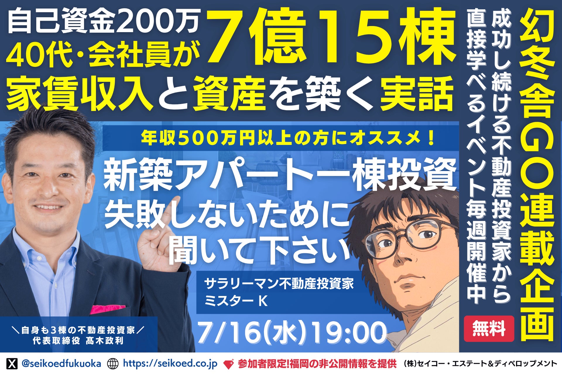 福岡で不動産投資・新築アパート経営を始めたい年収500万円以上の方は参加必須。幻冬舎GO記事で取り上げたサラリーマン投資家本人が登壇!セイコー・エステートが無料セミナーを2025年7月16日に開催。