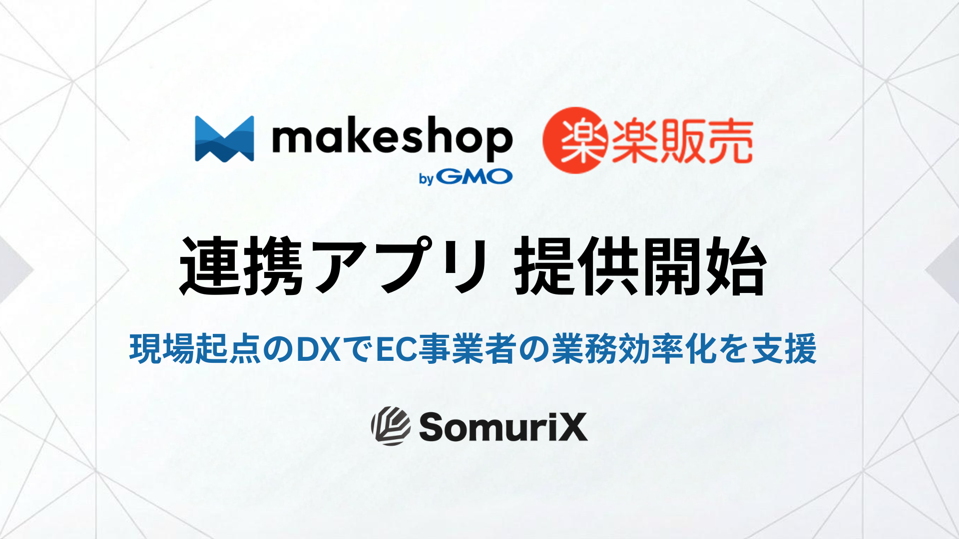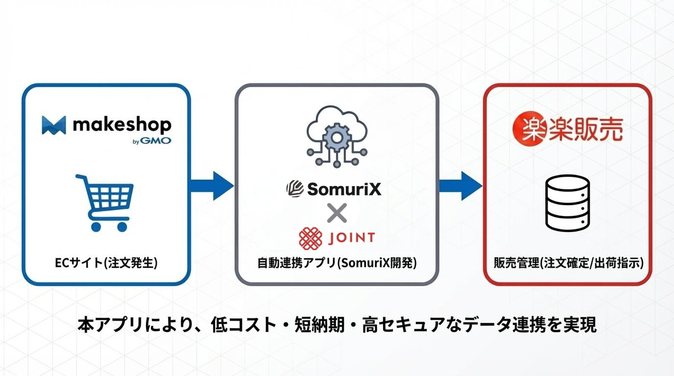 「IT」×「現場実装」×「運用定着」を軸に企業のDXを推進し、株式会社SomuriX(本社:福岡県福岡市、代表取締役:服部裕也、以下「SomuriX」)は、株式会社ストラテジットが提供するシステム連携基盤「JOINT」を活用し、GMOメイクショップ株式会社が提供するECサイト構築ソリューション「makeshop byGMO」と、株式会社ラクスが提供するクラウド型販売管理システム「楽楽販売」を連携させるアプリケーション(以下「本アプリ」)を開発し、提供を開始したことをお知らせいたします。