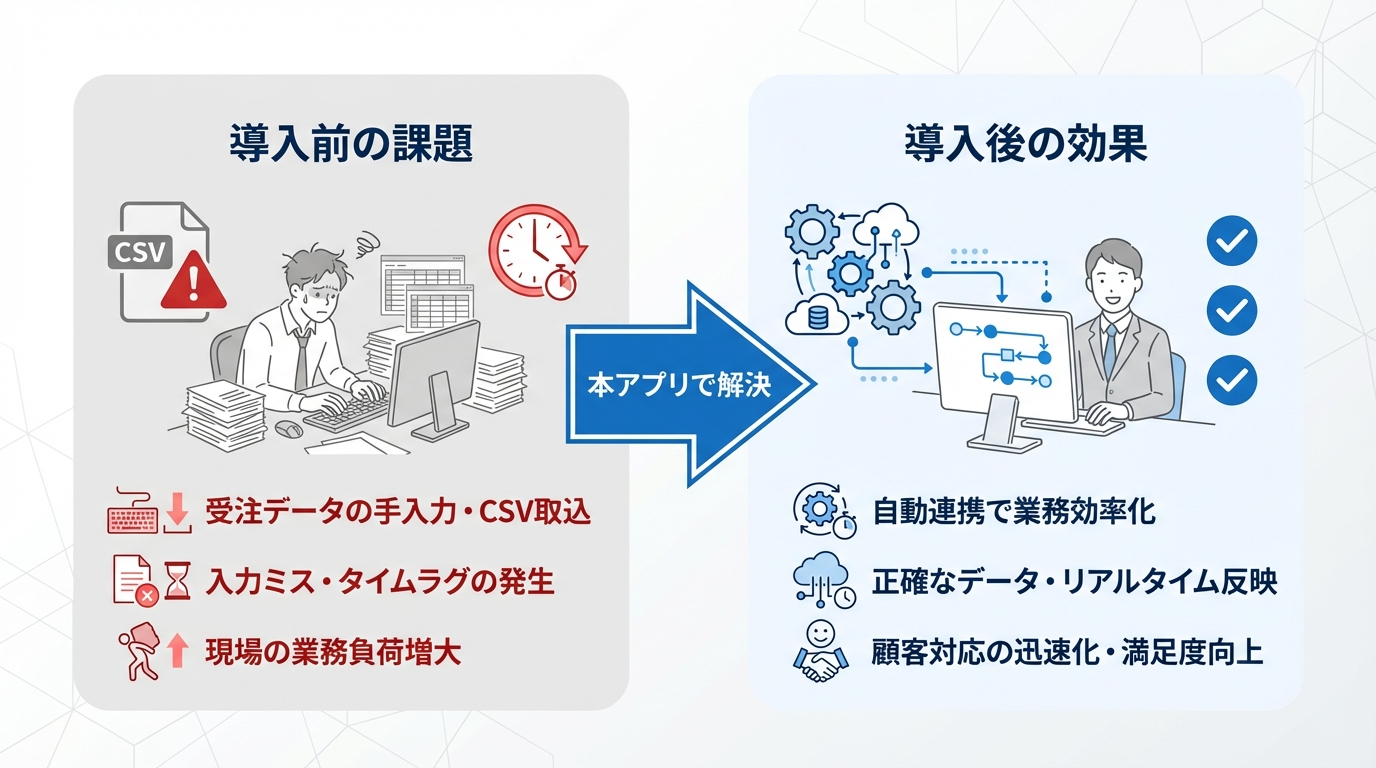 本アプリを通じて、現場の『データの二重入力』という課題を解決し、事業者が本来注力すべき「売ること・届けること」に専念できる環境を提供いたします。