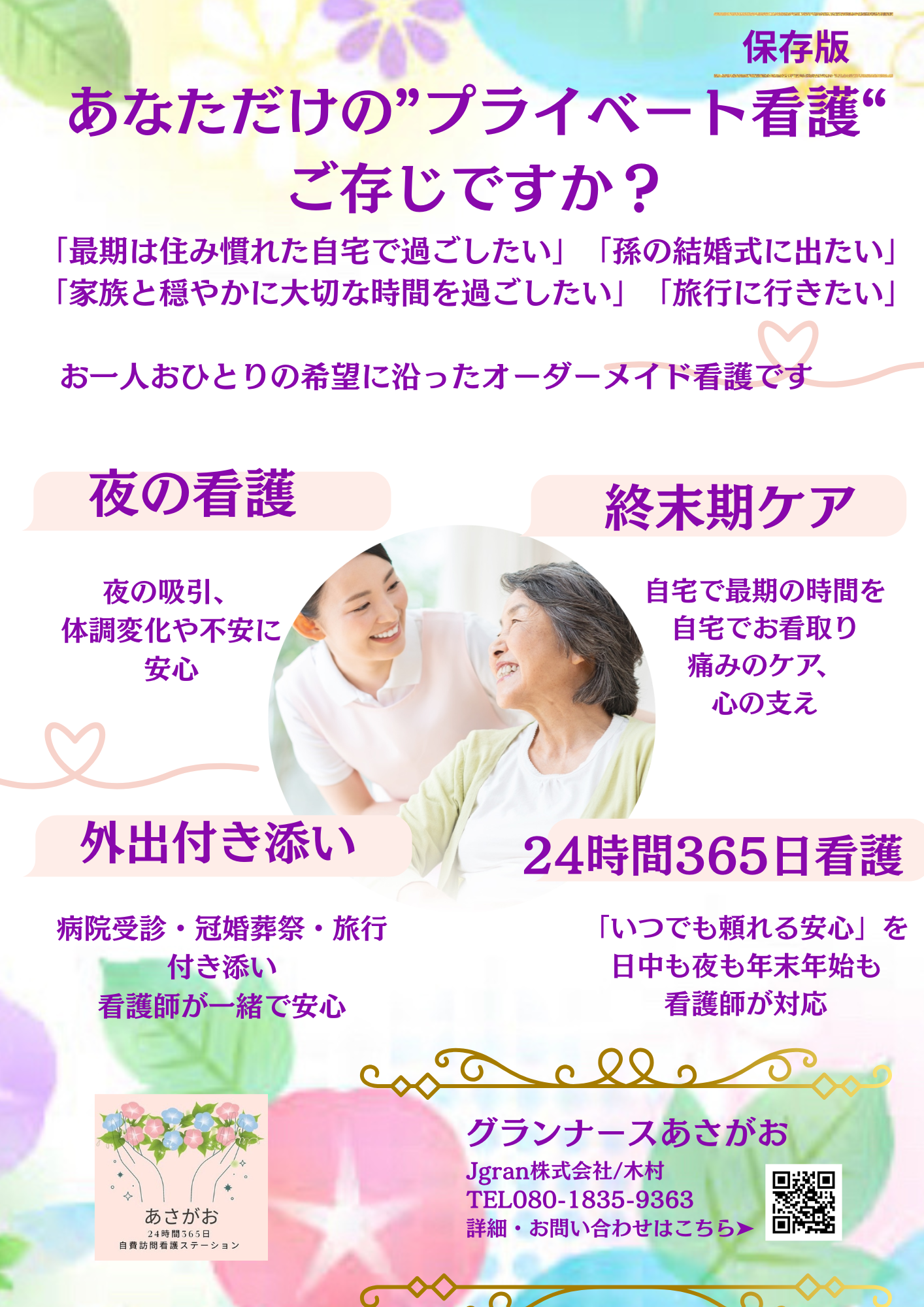 「グランナースあさがお」は、保険制度に依存せず、ご本人・ご家族が ”今、必要としている時間・場所・内容” に合わせて看護師が寄り添う、完全オーダーメイド型の訪問看護です。