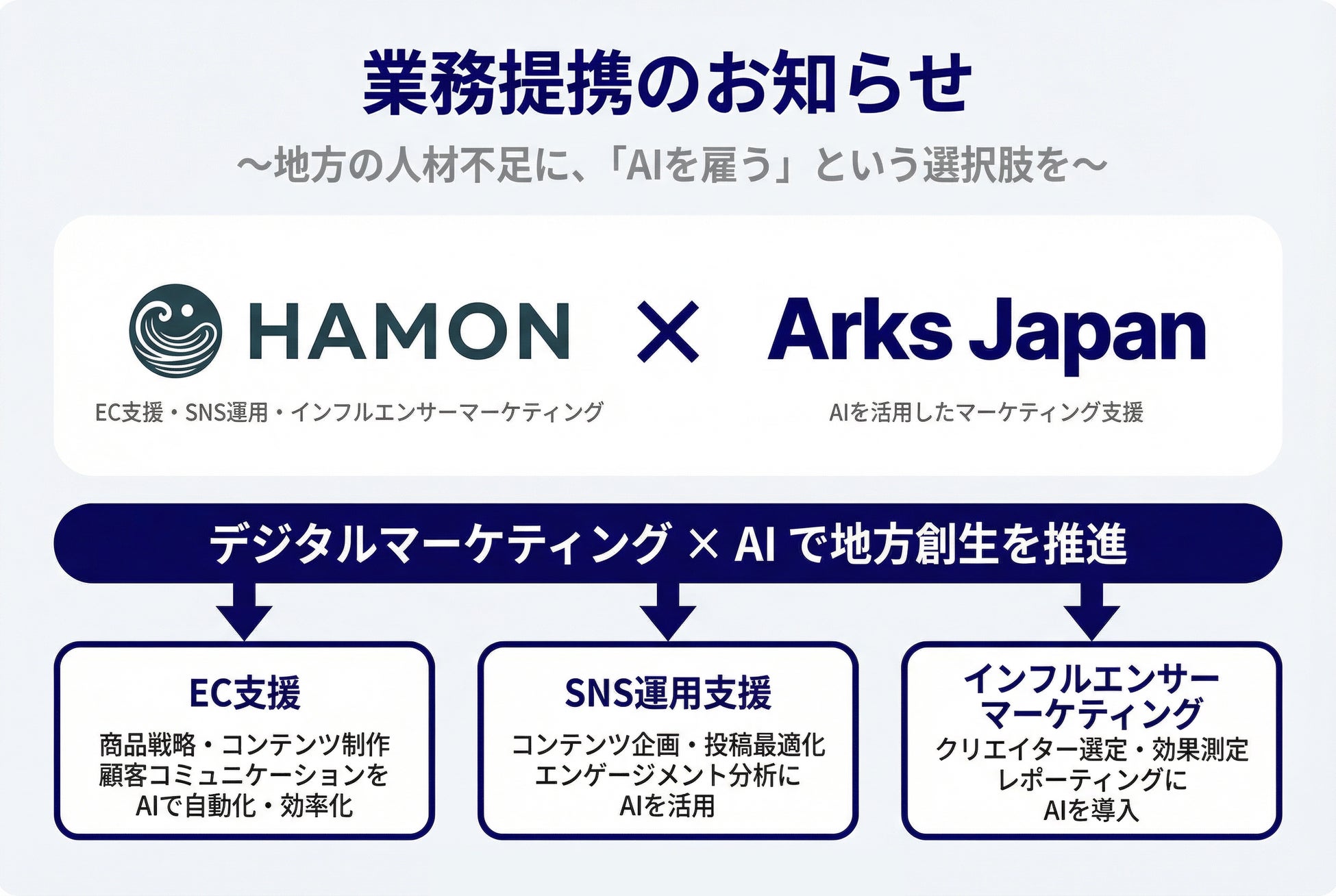 株式会社HAMONとArks Japan株式会社が業務提携。地方の人材不足をAIで解決する、次世代のEC・デジタルマーケティング支援へ