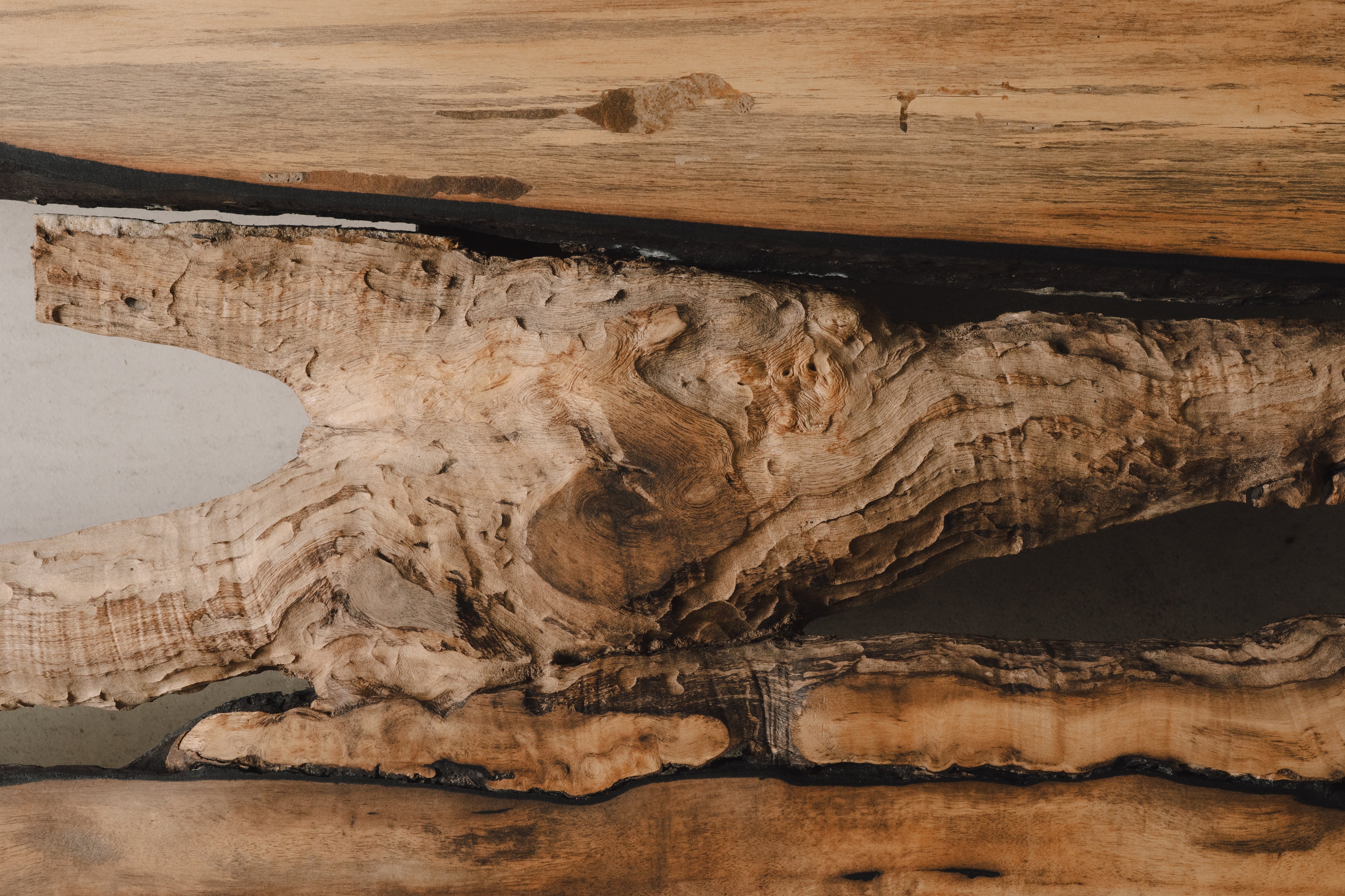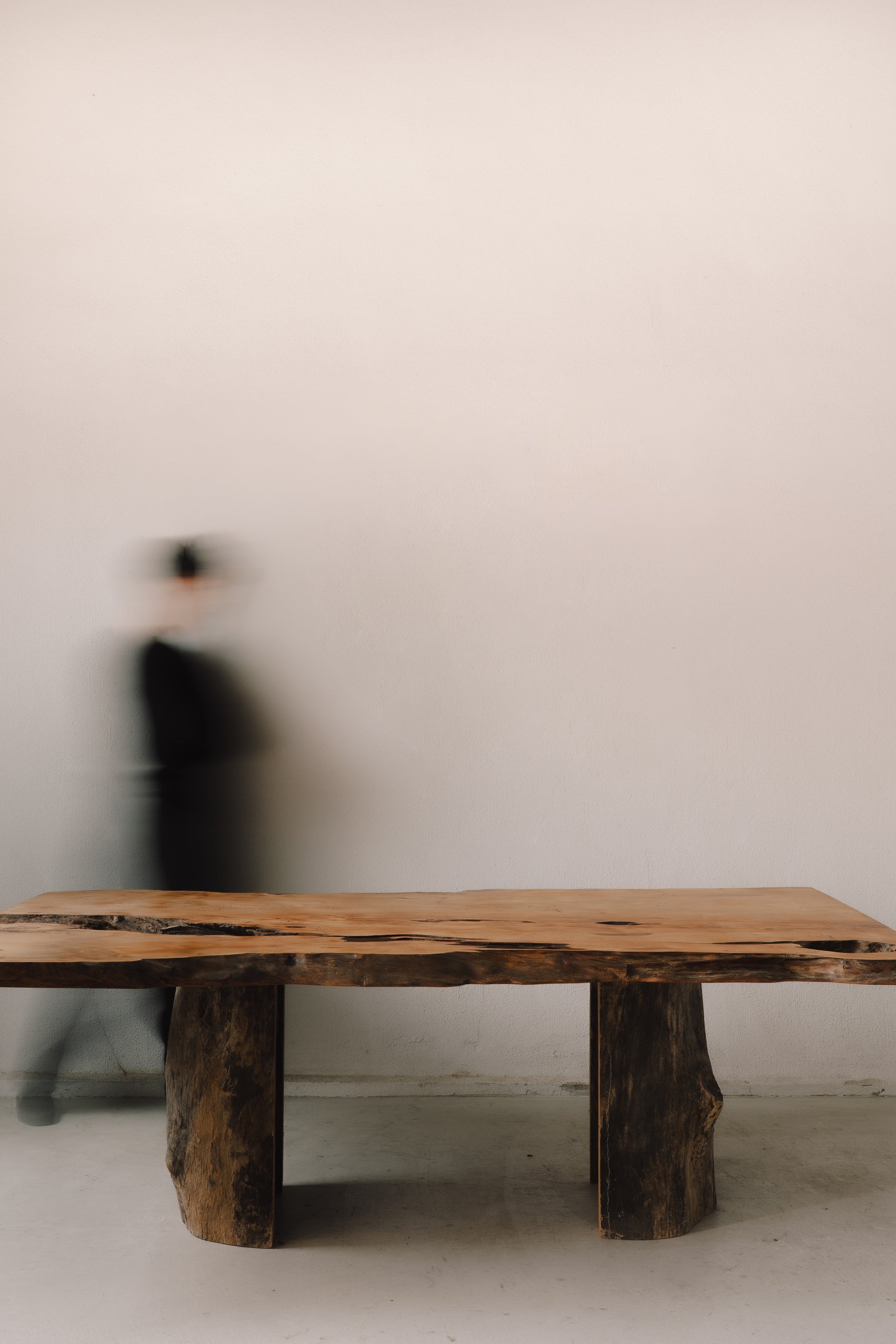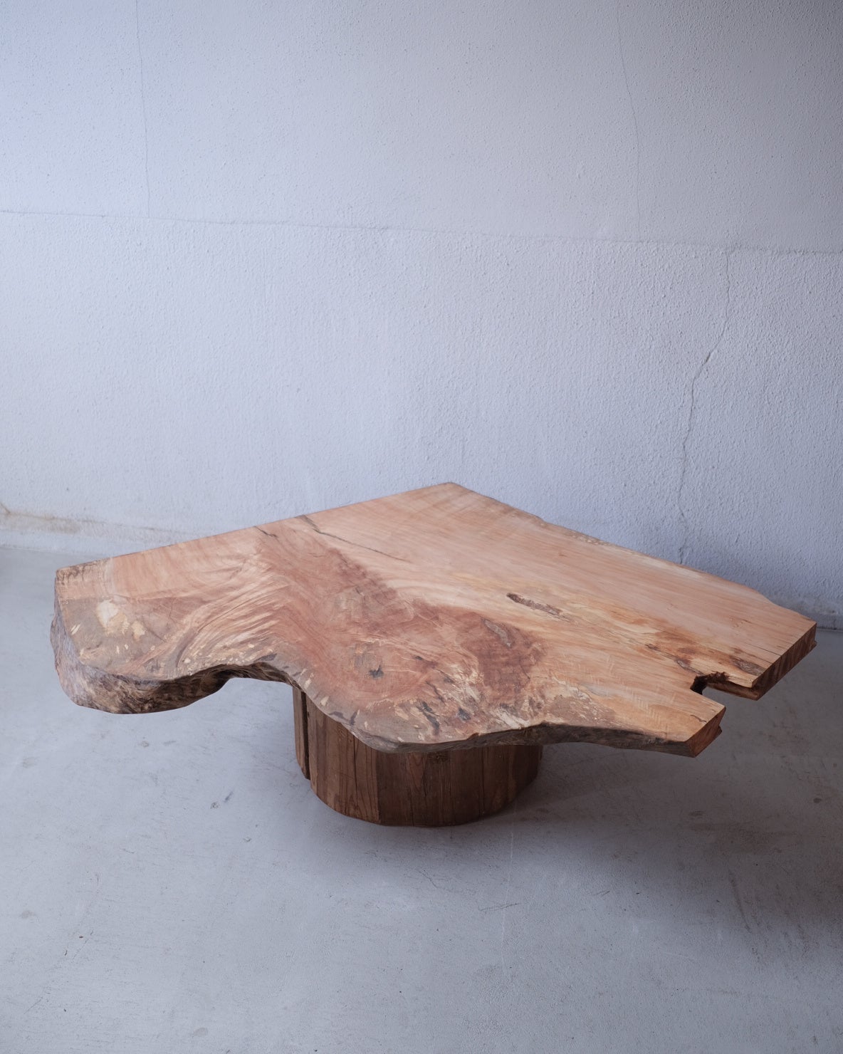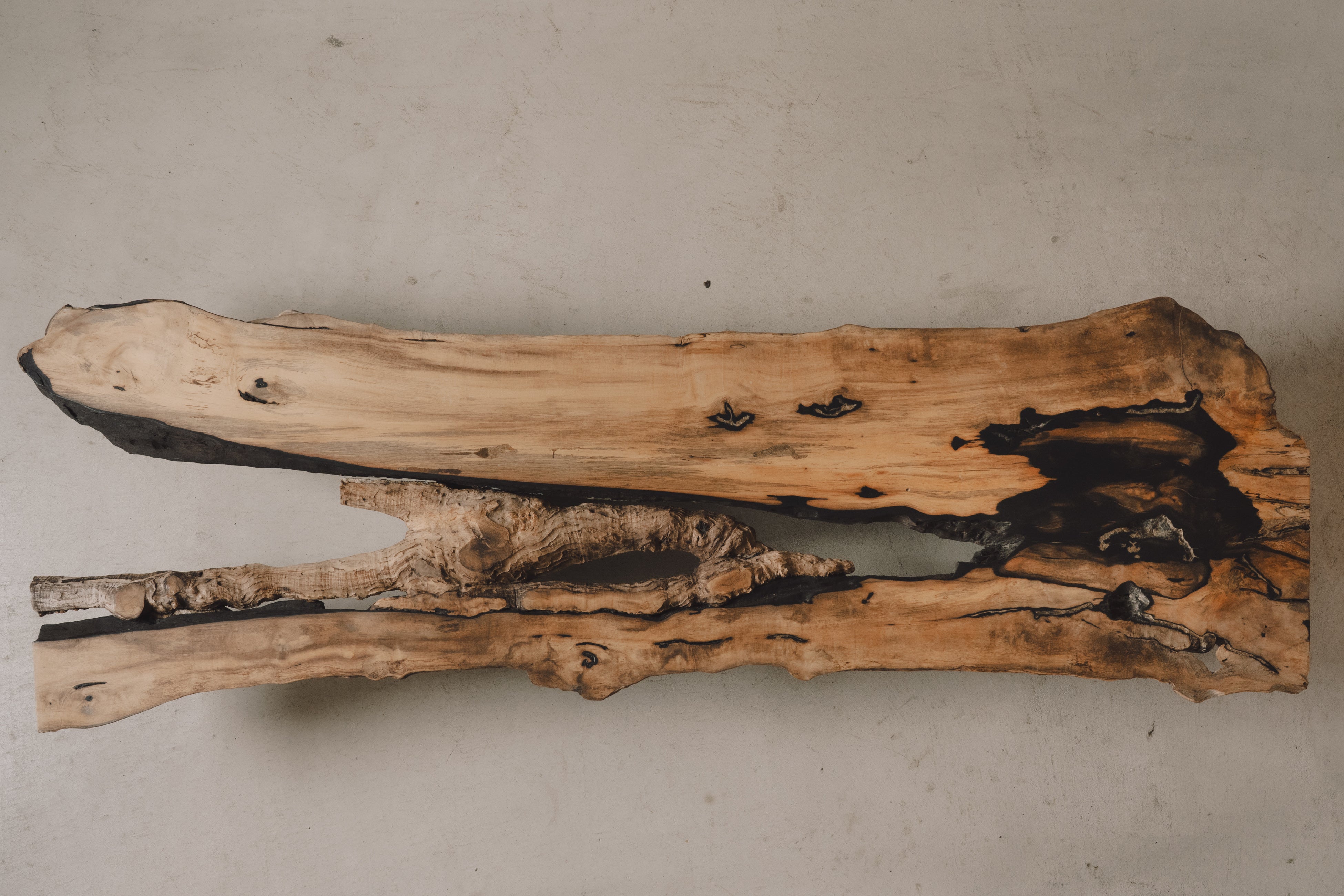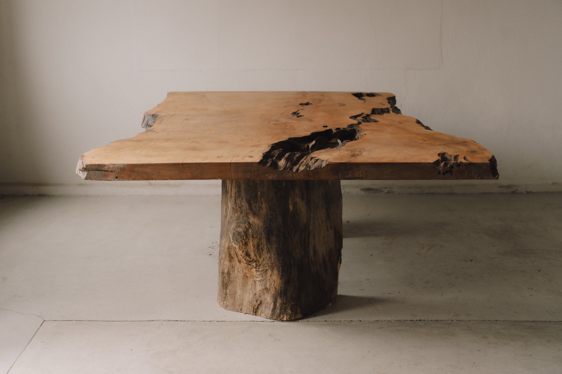 自然が刻んできた時間の痕跡を削り取るのではなく、そのまま受け止め、空間の中で静かに際立たせる。一枚板を単なる家具としてではなく、長い時間を生きてきた存在そのものとして提示する試みです。