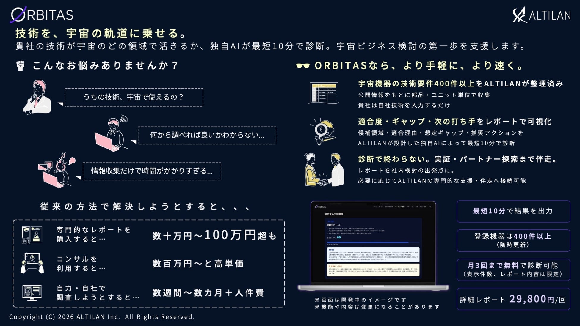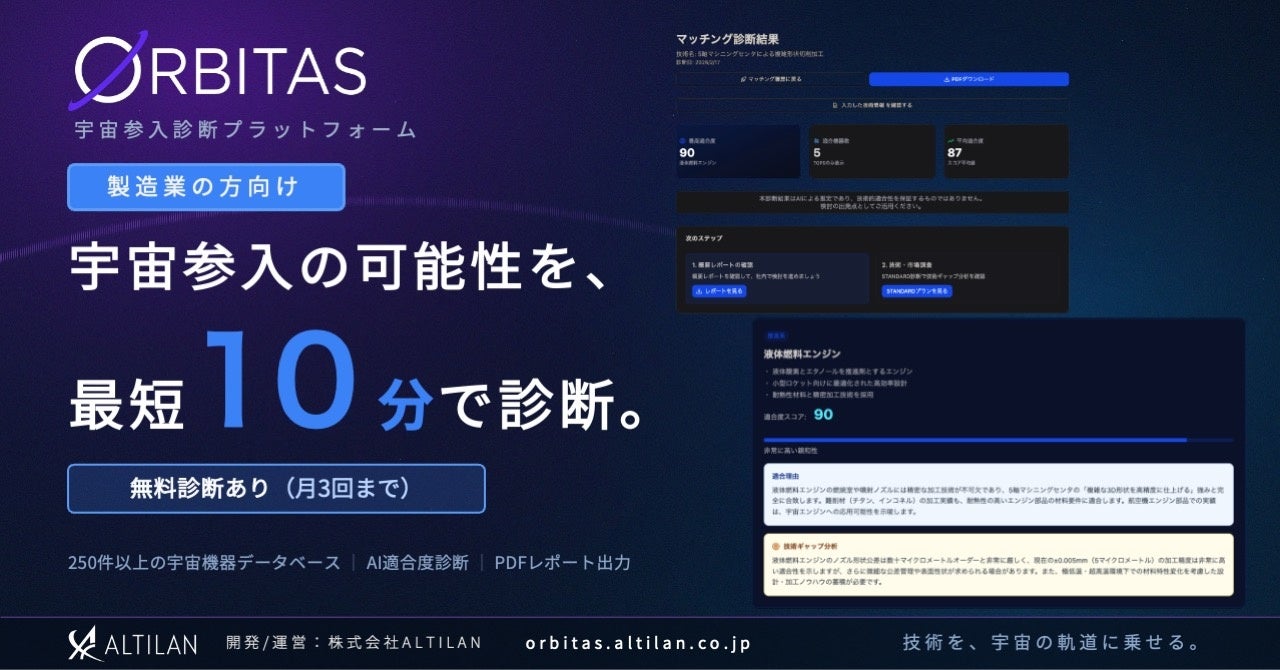 誰もが宇宙へ行ける時代の世界観を描き、文化の創造から宇宙ビジネスの共創まで一貫して推進する株式会社ALTILAN(本社:静岡県浜松市、代表取締役CEO:永利 光、以下、ALTILAN)は、宇宙参入診断プラットフォーム「ORBITAS(オルビタス)」の提供を開始いたします。