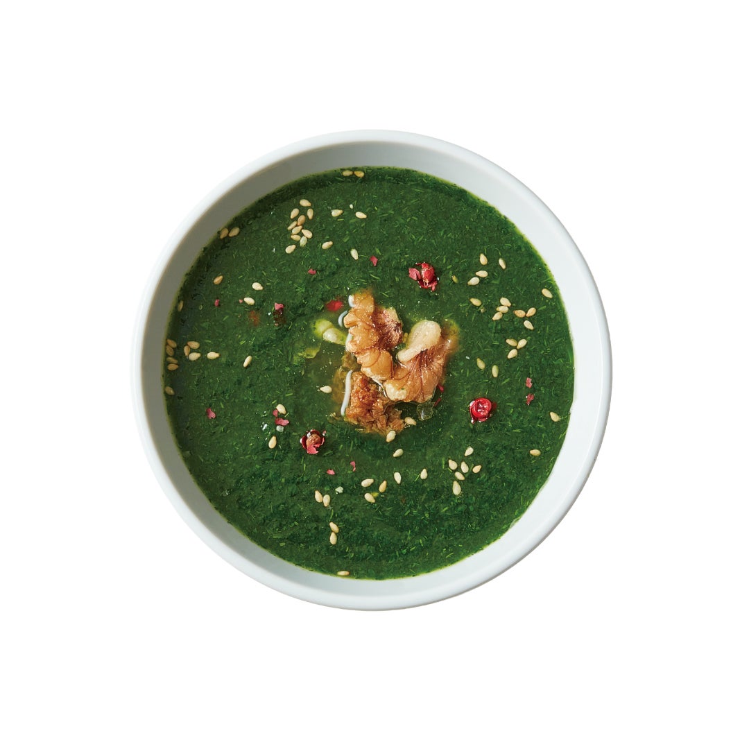旬の野菜や果物をすりつぶして、出汁でのばした和製ポタージュ「すりながし」は、和のスーパーフードと言える栄養価の高い小松菜に注目。合わせ出汁と少量の白味噌で仕立てたメニューは身体を温めながら、軽やかに整える一杯に仕上がっています。