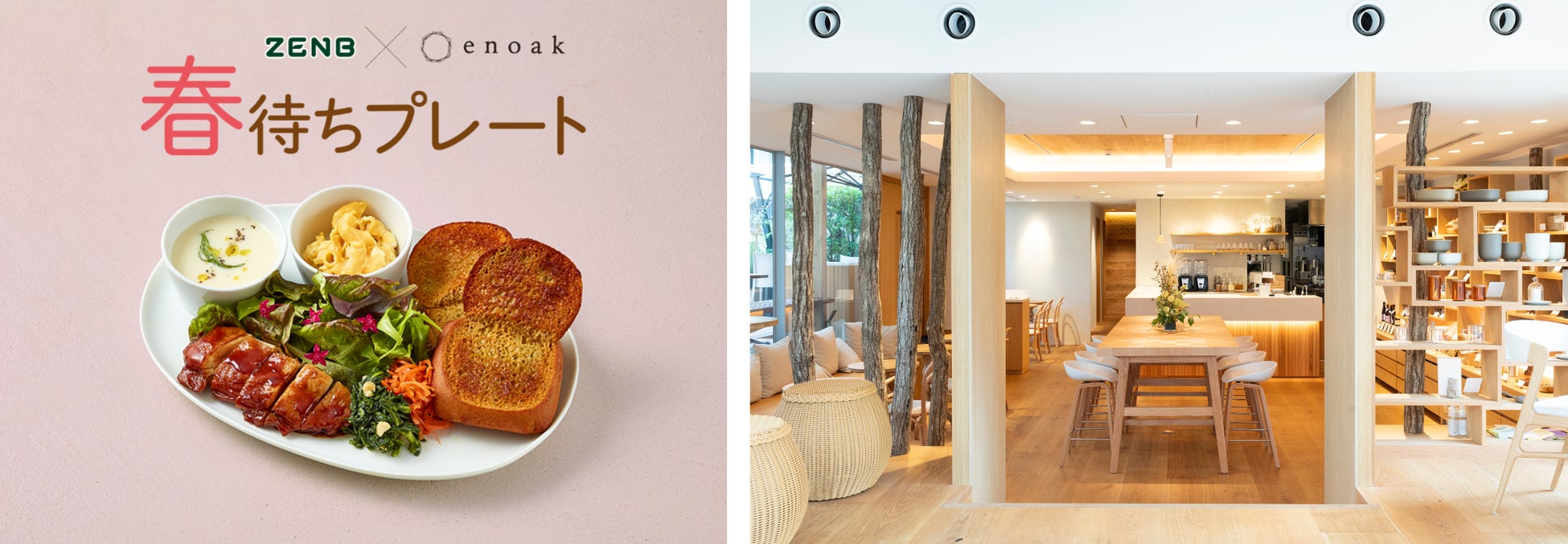 心と身体を慈しむ“養生”をコンセプトに掲げるライフスタイルカフェenoakでは、植物を可能な限りまるごと使ったウェルビーイングな食生活を提案するブランドZENBとコラボレーションし、2026年2月9日(月)から3月31日(火)までの期間限定で、新発売の「ZENB BREAD ふわもちロール」を使用した【enoak × ZENB 春待ちプレート】を提供いたします。