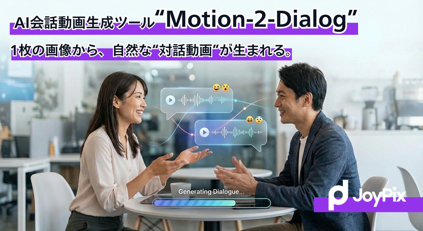 AIによるコンテンツ制作ツール「JoyPix.AI」を運営する合同会社JoyPix(本社:東京都江東区)は、2025年12月18日(木)より、静止画から高品質な対話動画を生成できる新機能「Motion-2-Dialog(モーション・ツー・ダイアログ)」を正式リリースいたしました。
