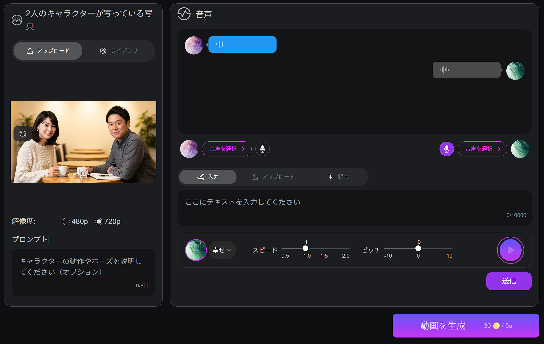 それぞれのキャラクターに話させたい内容を入力(または音声アップロード)し、声質や感情を選択します。
