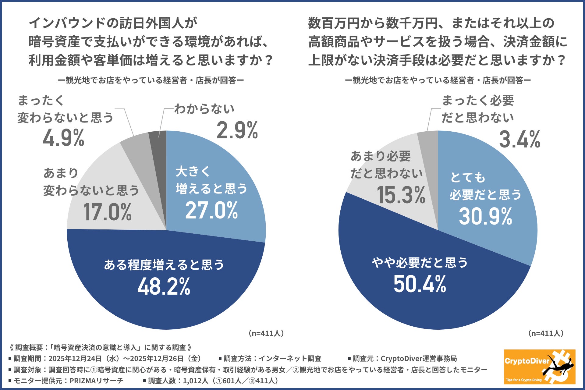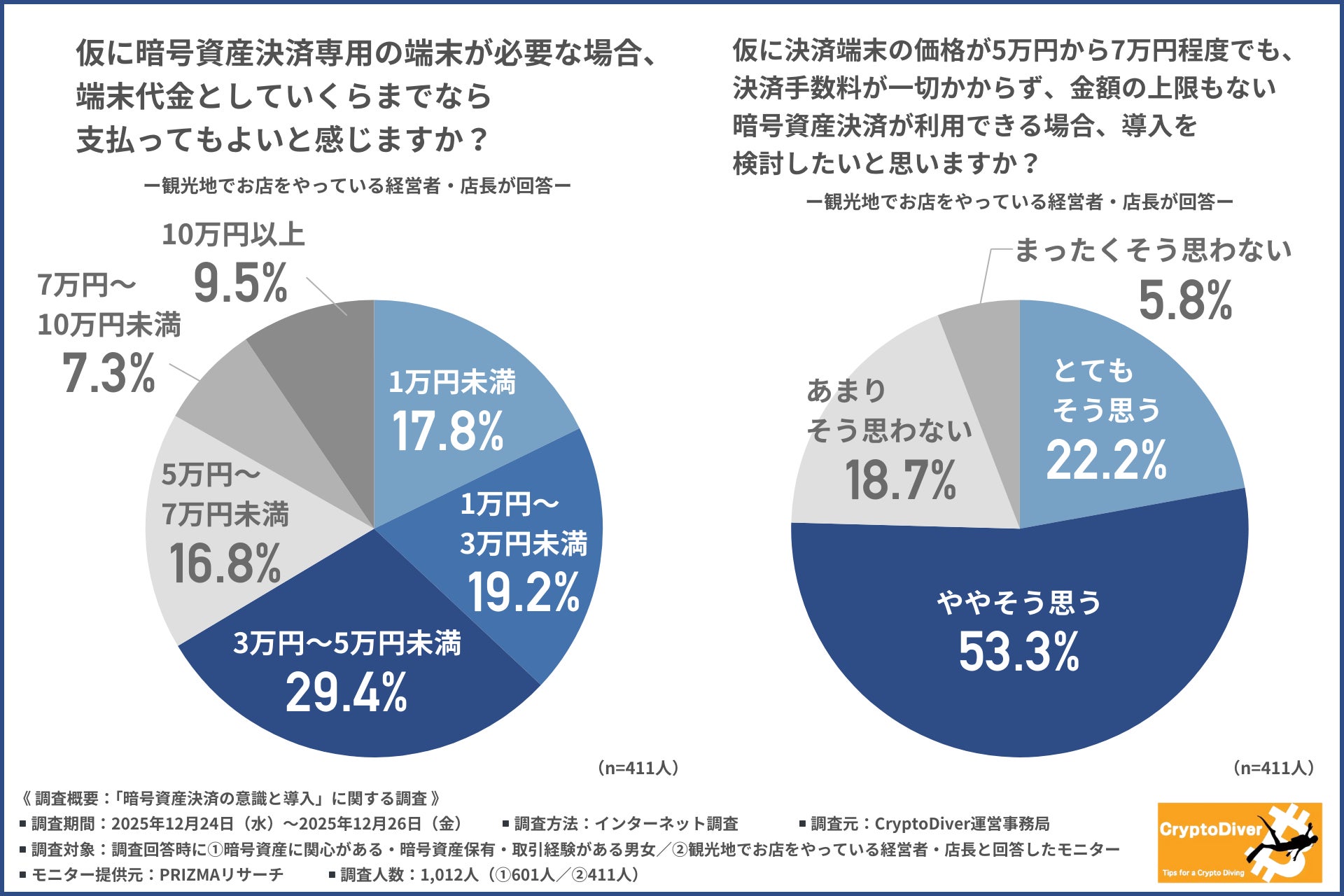 CryptoDiver運営事務局は、①暗号資産に関心がある・暗号資産保有・取引経験がある男女/②観光地でお店をやっている経営者・店長を対象に、「暗号資産決済の意識と導入」に関する調査を行いました。
