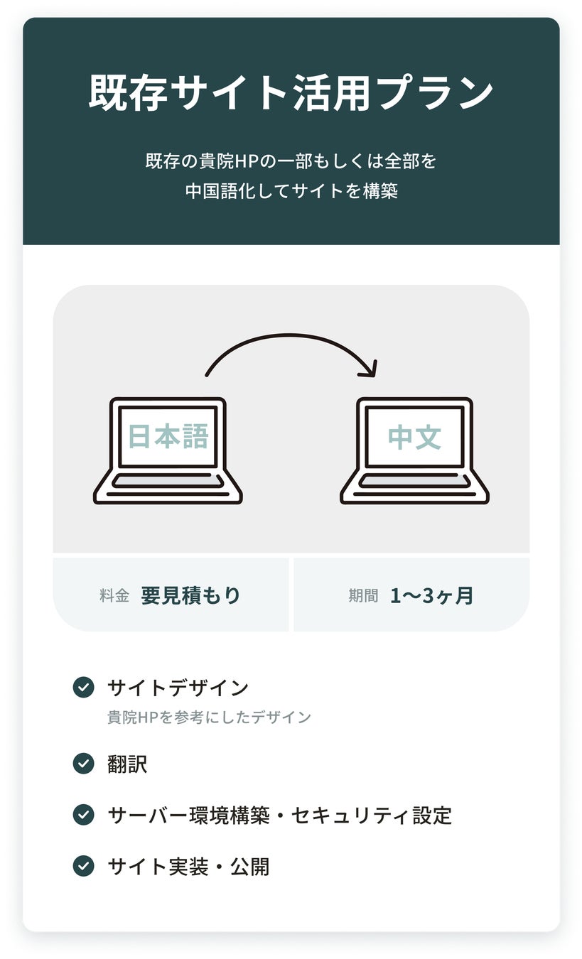 医療専門チームによる監修のもと、中国人ユーザーの視点を取り入れたデザイン設計、医療分野に特化した翻訳体制、そして中国本土からも安定して閲覧できる環境構築をワンストップで提供します。