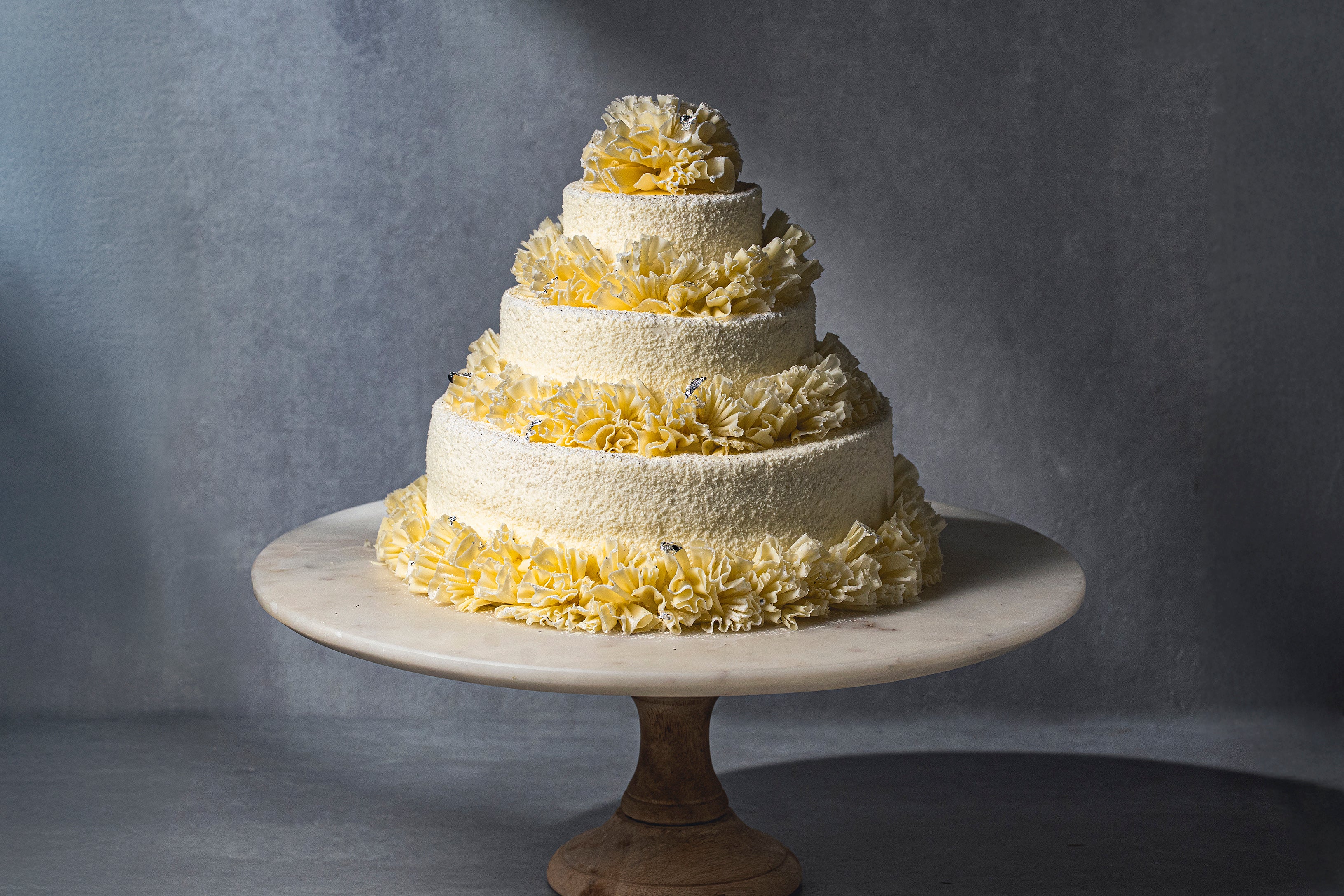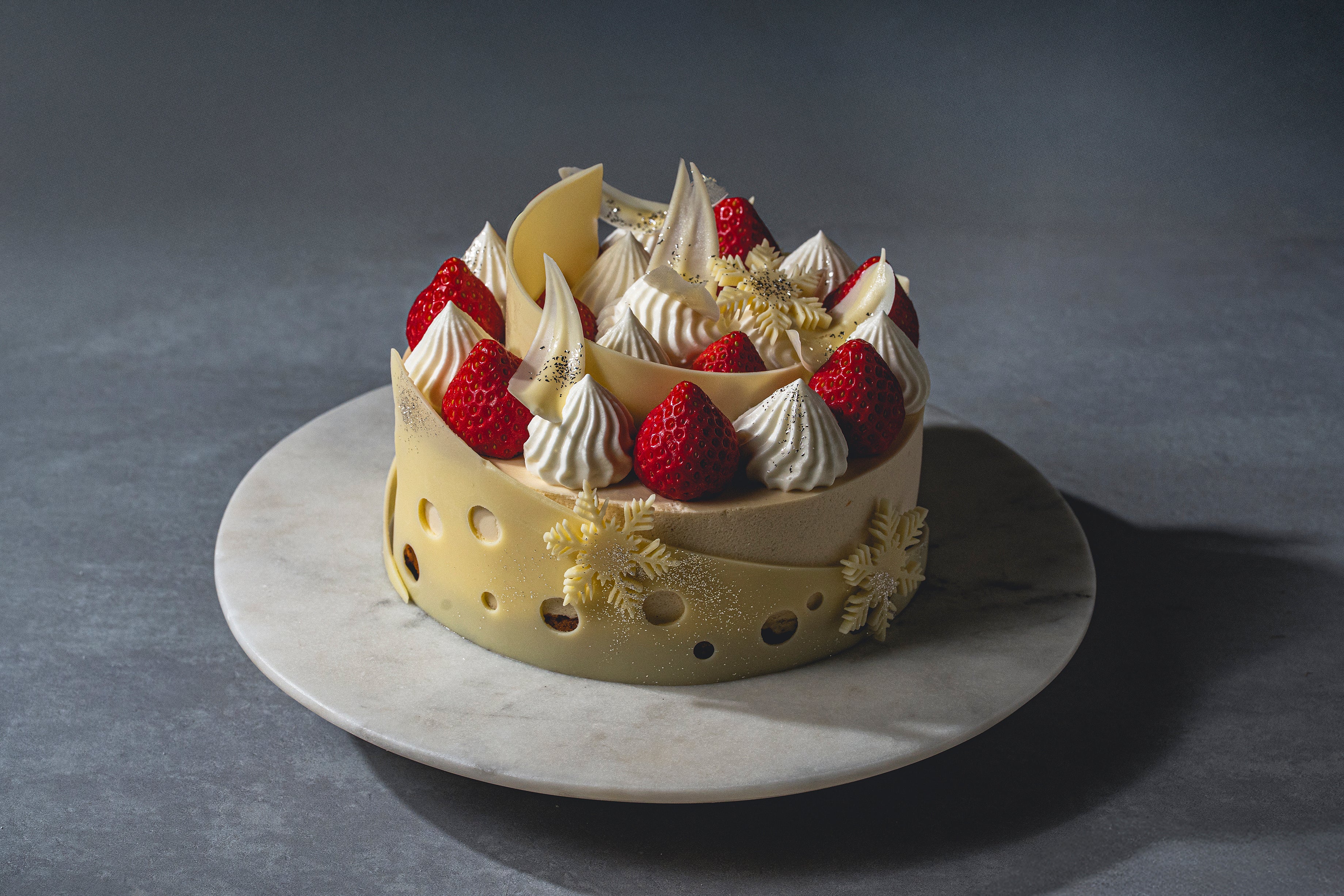 軽やかなホワイトチョコレートのフリルをまとった、華やかな3段のクリスマスケーキで特別なひと時をお過ごしください。