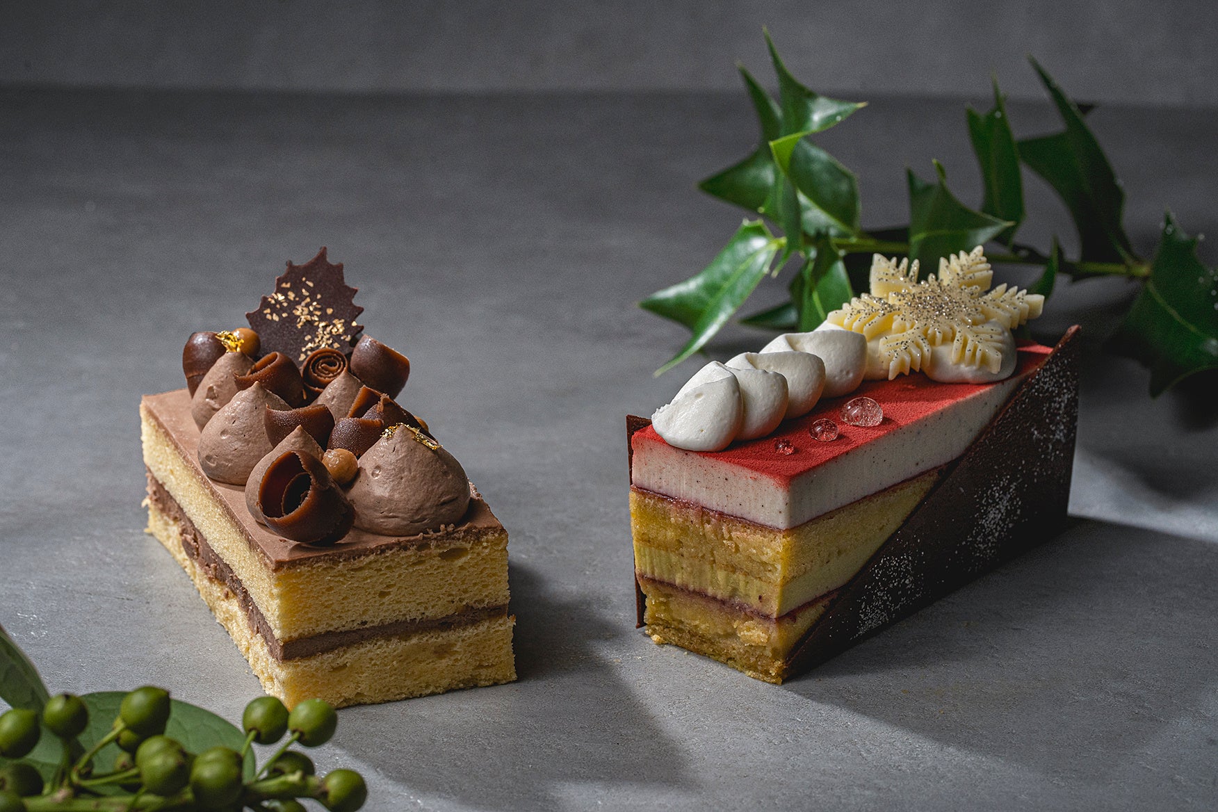 ふわふわのスフレ生地に、まろやかなチョコレートの生クリームを層にして重ね合わせて、クリスマス風のデコレーションで仕上げました。