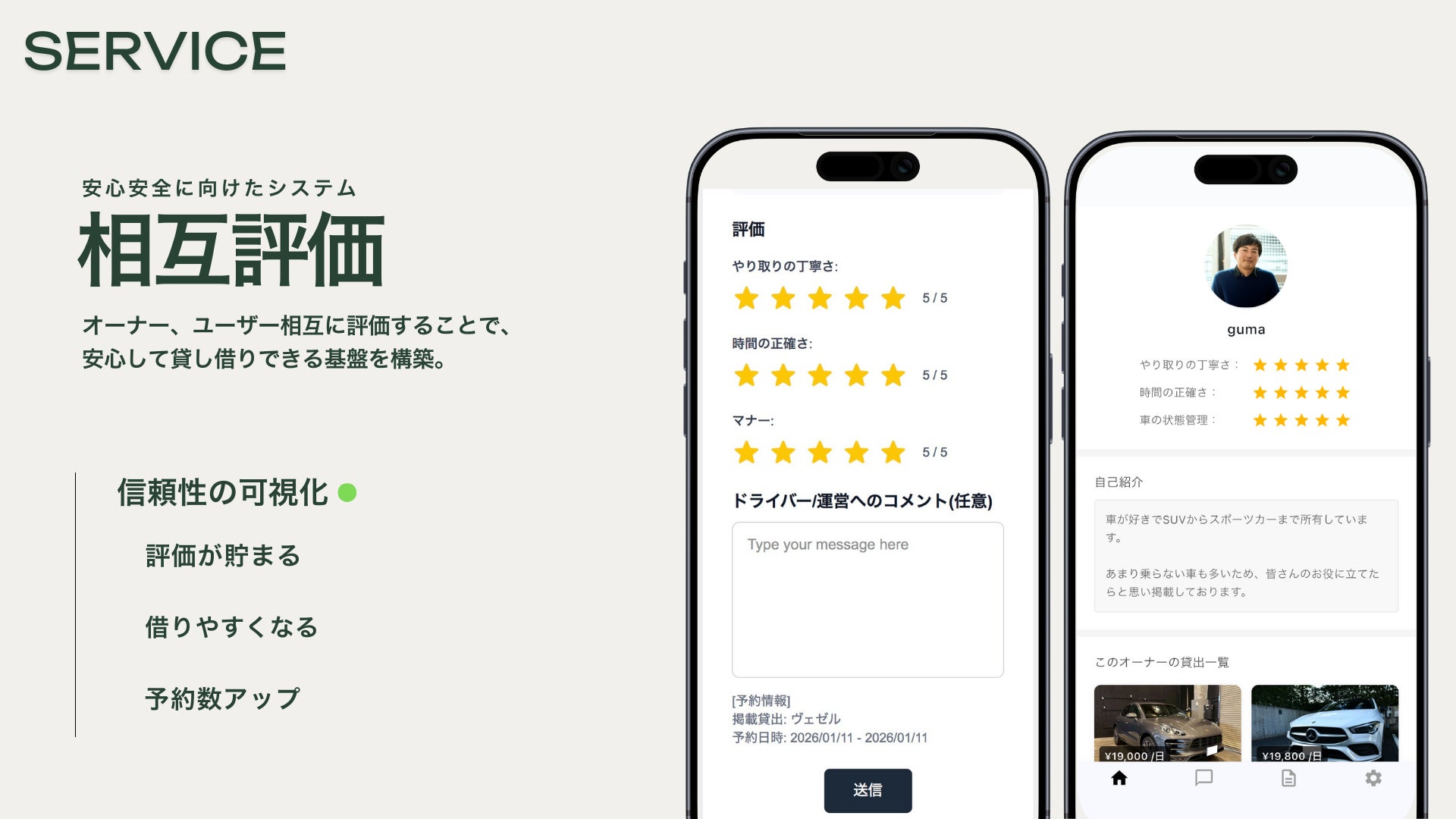 さらに、自動車保険料、税金、駐車場代など、車両を使用していない間も月数万円単位の固定維持費が発生する現状は、ユーザーの負担感を大きくしています。このような背景のもと、私たちは「乗らない日に貸し出す前提で中古車を買う」選択肢を提供し、最大実質負担ゼロで車を所有できる「0円マイカー」という新しい所有のカルチャーを開拓していきます。