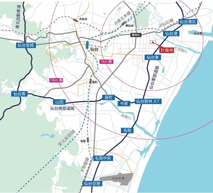 本件の計画地は、仙台駅から7kmと市街地からもアクセス良好な立地に位置しています。また、東北・関東への大動脈となる仙台東部道路・国道45号まで10分圏内で往来が可能な好立地を生かし、仙台市内だけでなく、東北・関東エリアへの広域配送に適した立地となっております。仙台港、仙台空港も配送圏内であり、荷物の特性に合わせて輸送を使い分け、シームレスにお客様のお手元へ荷物をお届けすることが実現できる立地です。