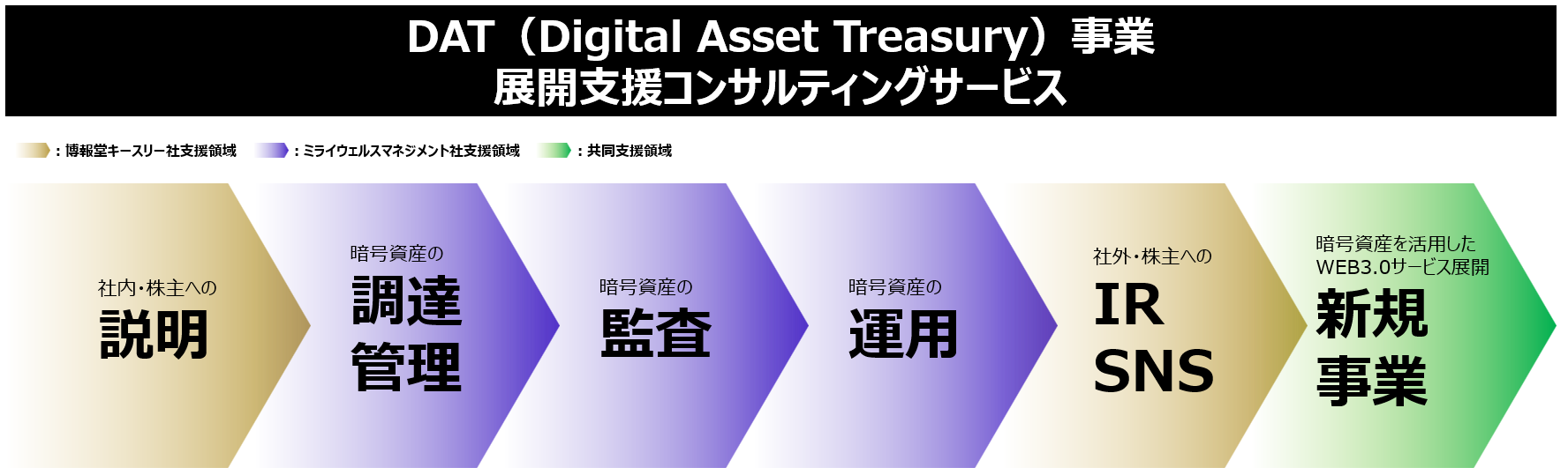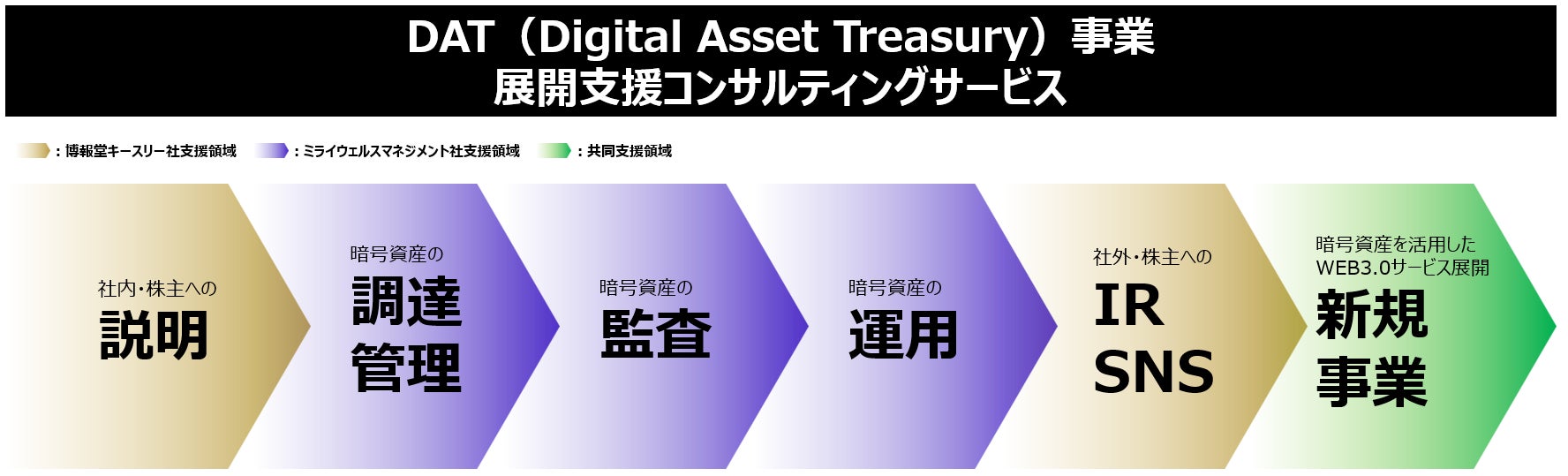 MWMと博報堂キースリーがパートナーシップを締結することにより、通称DAT(Digital Asset Treasury)と呼ばれる暗号資産トレジャリー事業に係る実現支援をサービス提供し、日本国内における事業会社によるデジタル資産保有を促進いたします。両社共同でのサービス提供により、以下の支援が実現可能となります。
