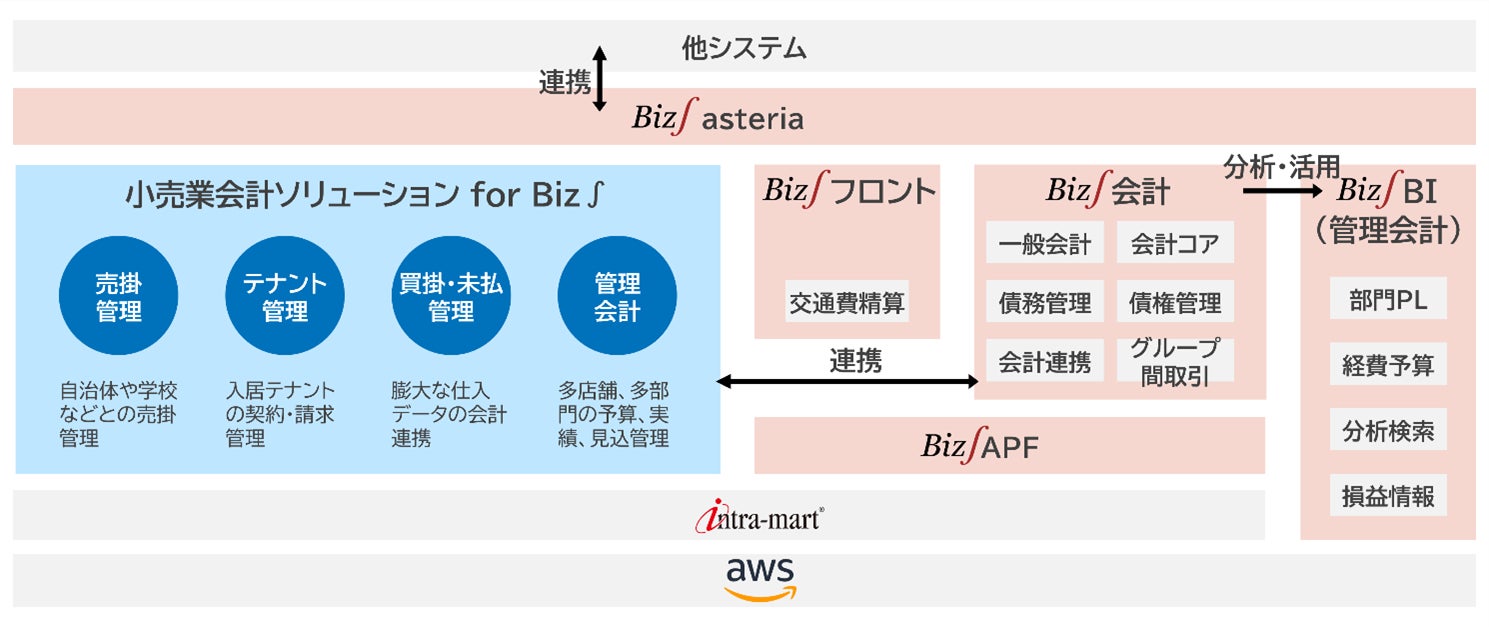 「小売業会計ソリューション for Biz∫」は、株式会社NTTデータ・ビズインテグラル(以下:NTTデータ・ビズインテグラル)が提供するERPパッケージソフトウェア「Biz∫」を中核として構築した、小売業向けソリューションです。