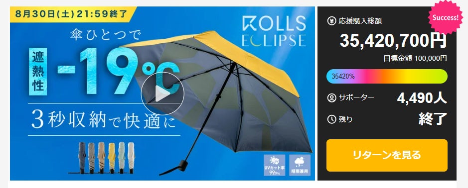 本プロジェクトは2025年7月25日の開始以降、初日に目標の100,000円を大きく上回る500万円を達成し、わずか3日未満で1,000万円を突破しました。その後も猛暑対策の機能性・利便性が多くの支持を集め、最終日には合計3,500万円を達成してクラウドファンディングプロジェクトが終了。前作「ROLLS MAX」に続き、傘カテゴリで話題のプロジェクトとなります。
