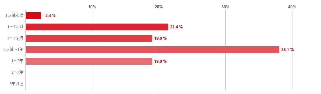 「6ヶ月~1年」が38.1%と最も多く、「1~3ヶ月」が21.4%、「3~6ヶ月」と「1~2年」が共に19.0%という順となり、1ヶ月から2年未満の人が多くの割合を占めた。