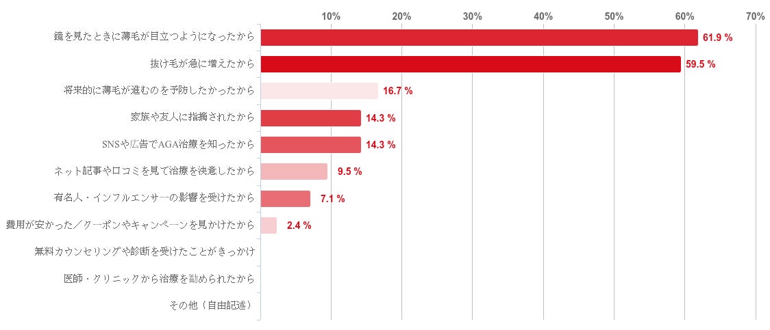 「鏡を見たときに薄毛が目立つようになったから」が61.9%で6割を超えて最も多く、「抜け毛が増えたから」も僅差の59.5%と6割近い回答を集めた。