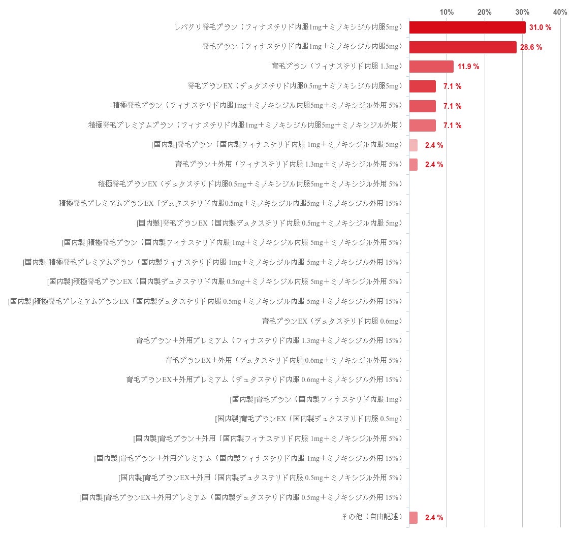 「レバクリ発毛プラン(フィナステリド内服1mg+ミノキシジル内服5mg)」と回答した人が31.0%で最も多く、次いで「発毛プラン(フィナステリド内服1mg+ミノキシジル内服5mg)」も28.6%で続き、この二つが多い回答となった。
