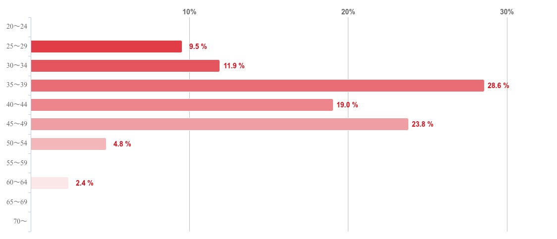 「35〜39歳」と回答した人が31.0%で最も多く、次いで「30〜34歳」と「40〜44歳」が同率で21.4%、「45〜49歳」が11.9%という順となった。