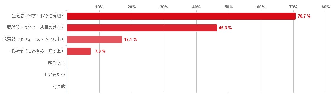 「生え際(M字・おでこ周辺)」と回答した人が70.7%と最も多く、次いで「頭頂部(つむじ・地肌の見え)」が46.3%で続いた。